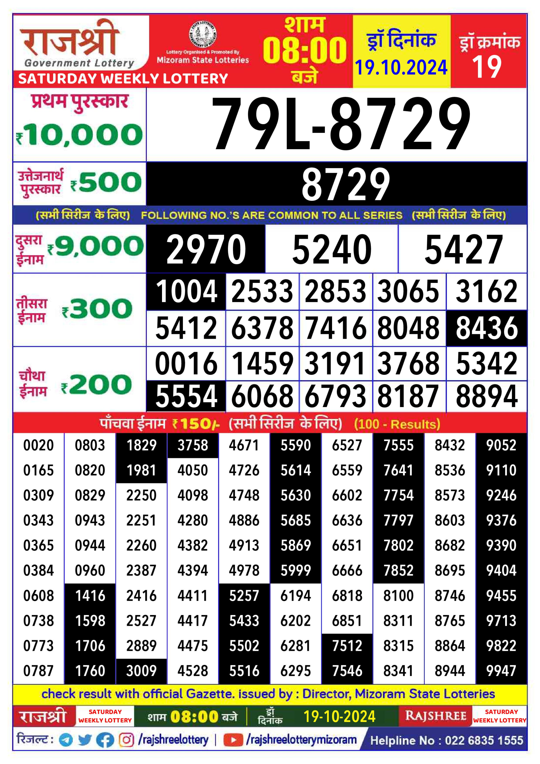 Rajshree  Weekly Lottery 8PM Result 19.10.24