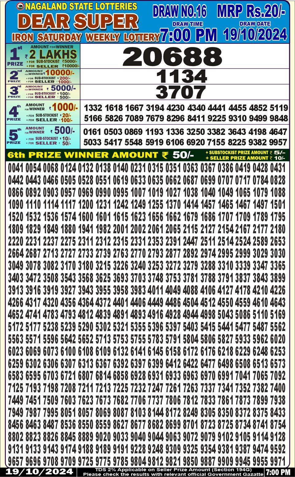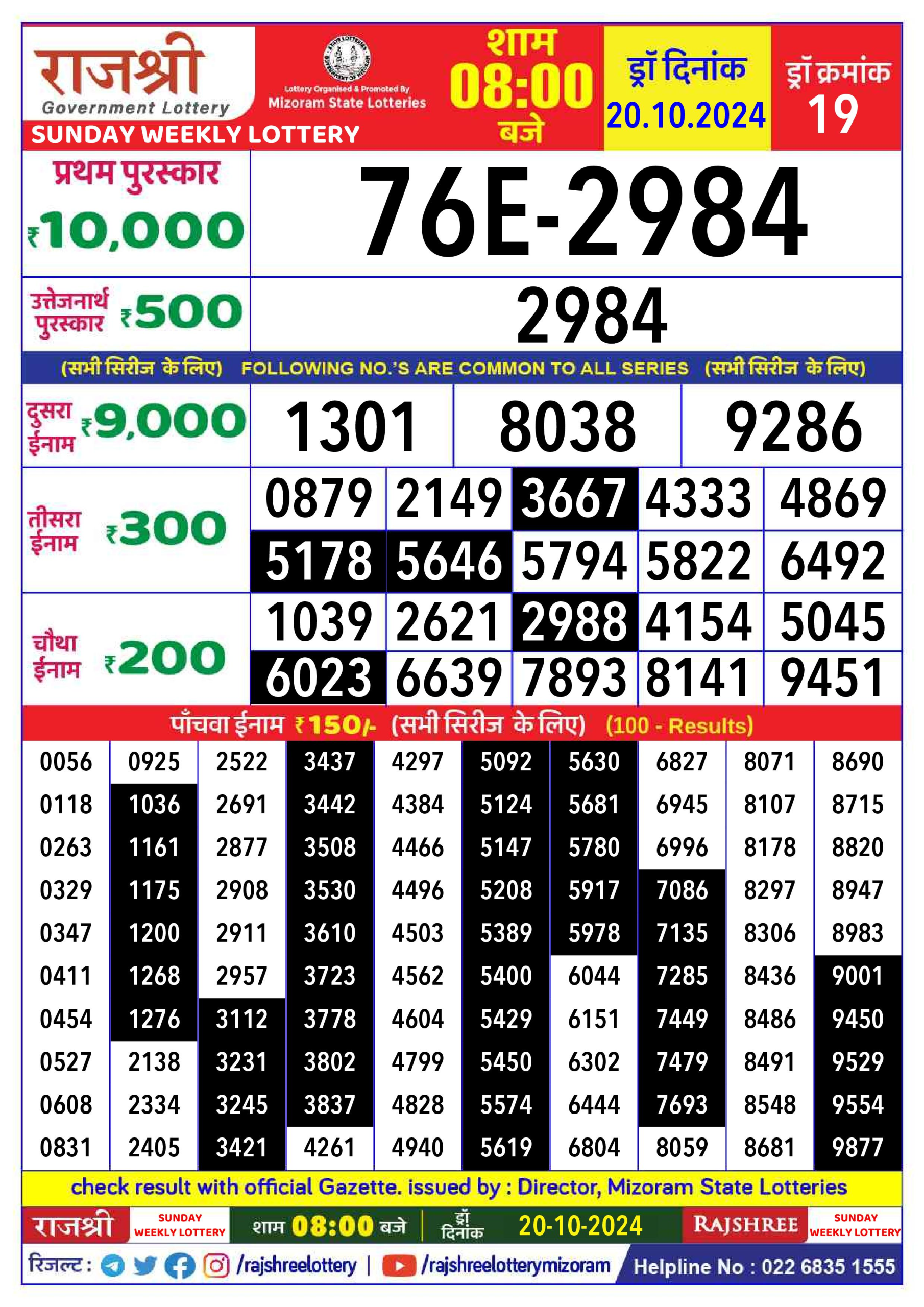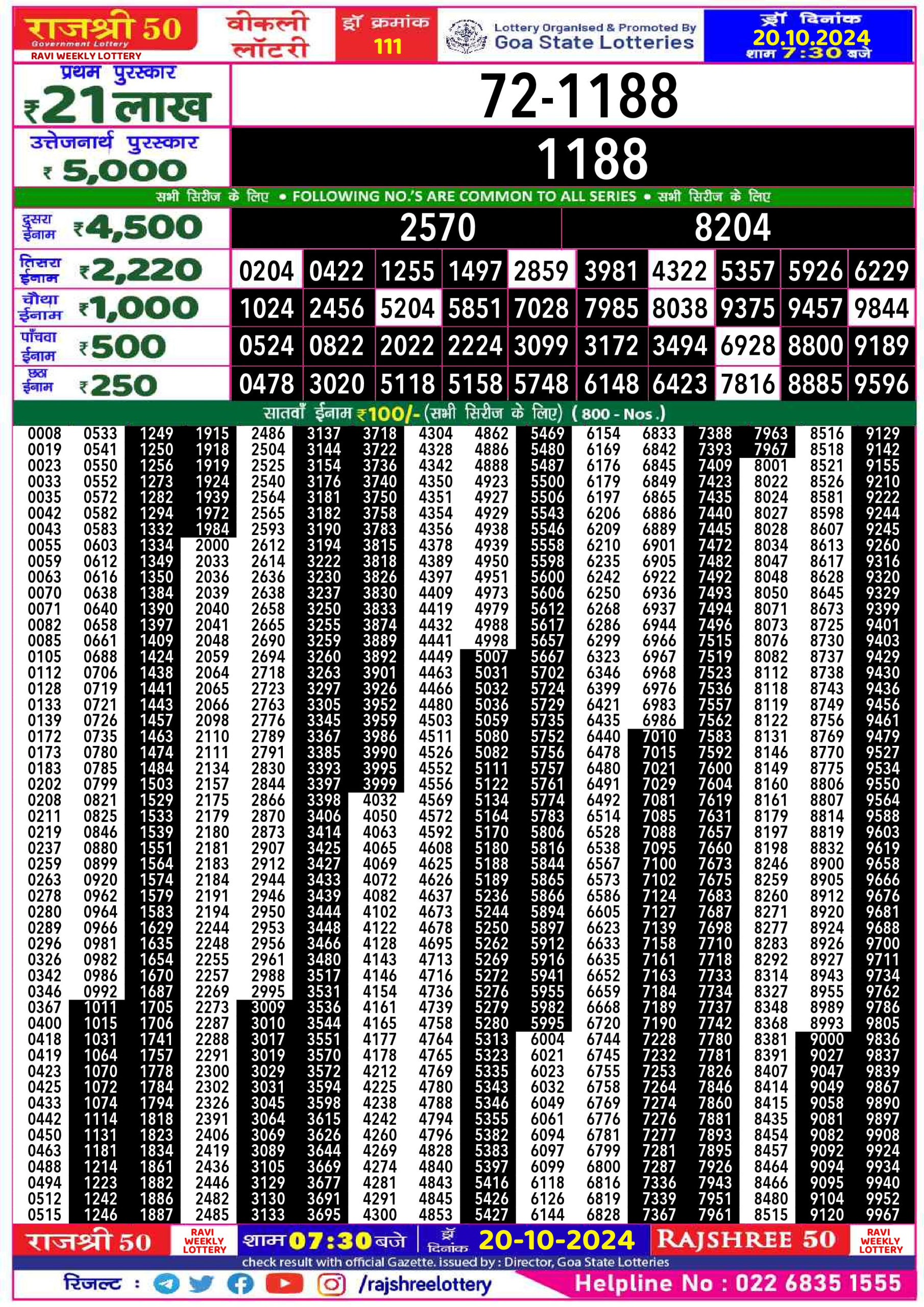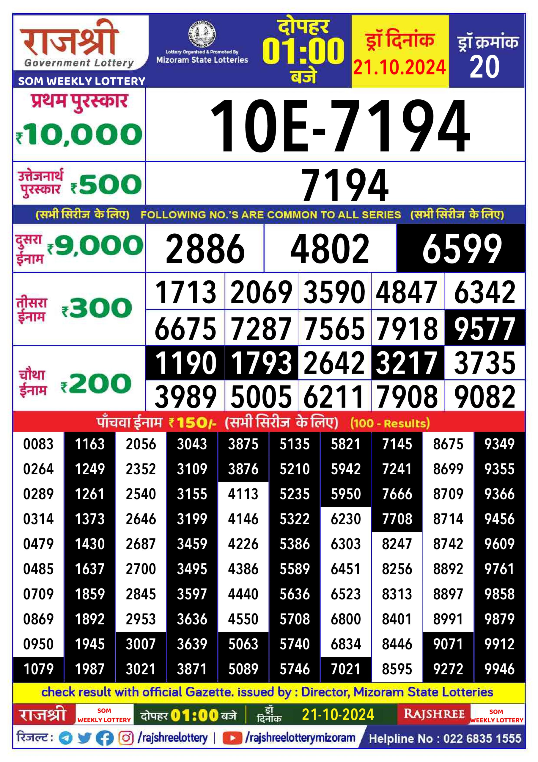 Rajshree 50  Lottery 7:30PM Result 20.10.24