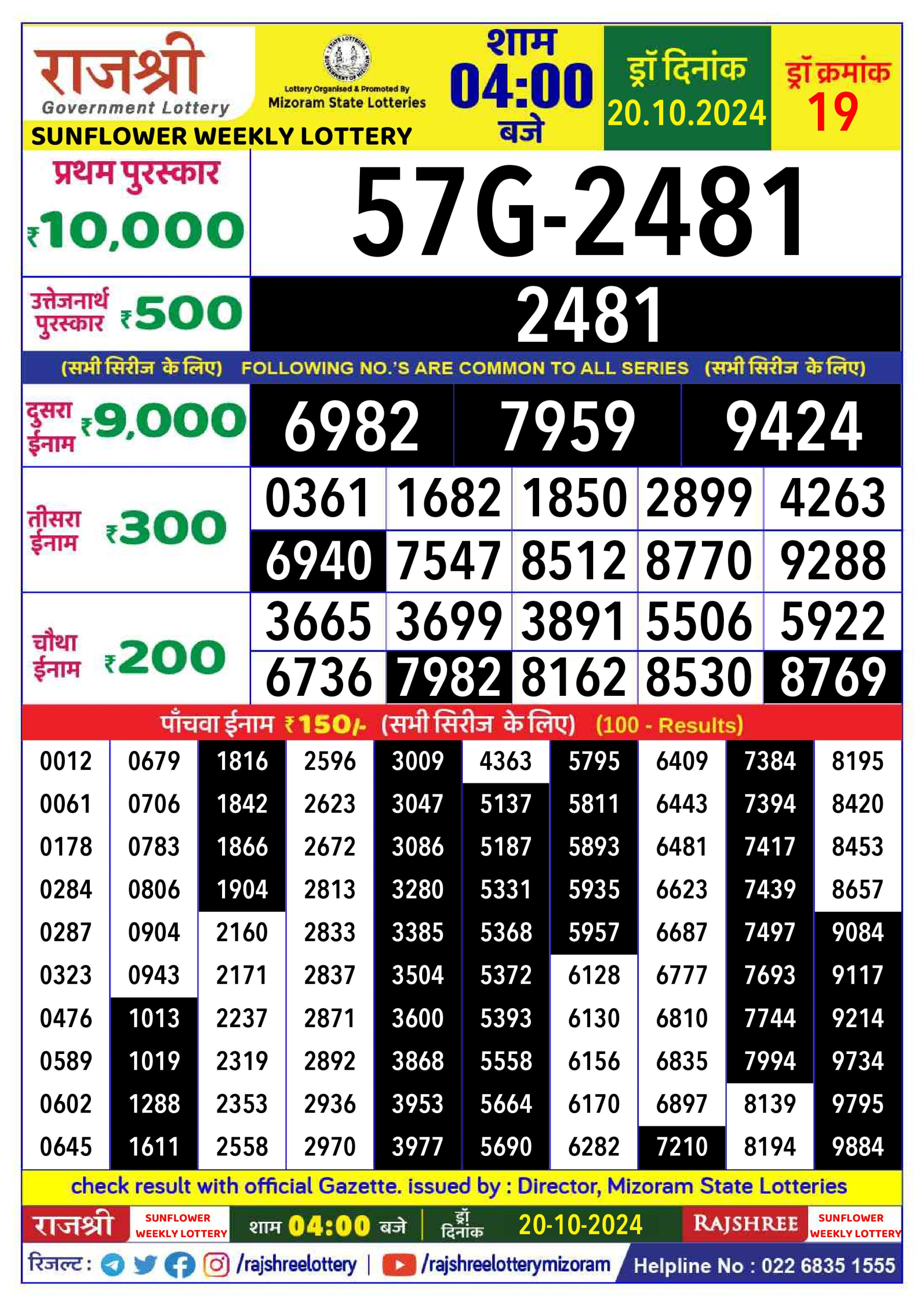 Rajshree sunflower  Weekly Lottery 4PM Result 20.10.24