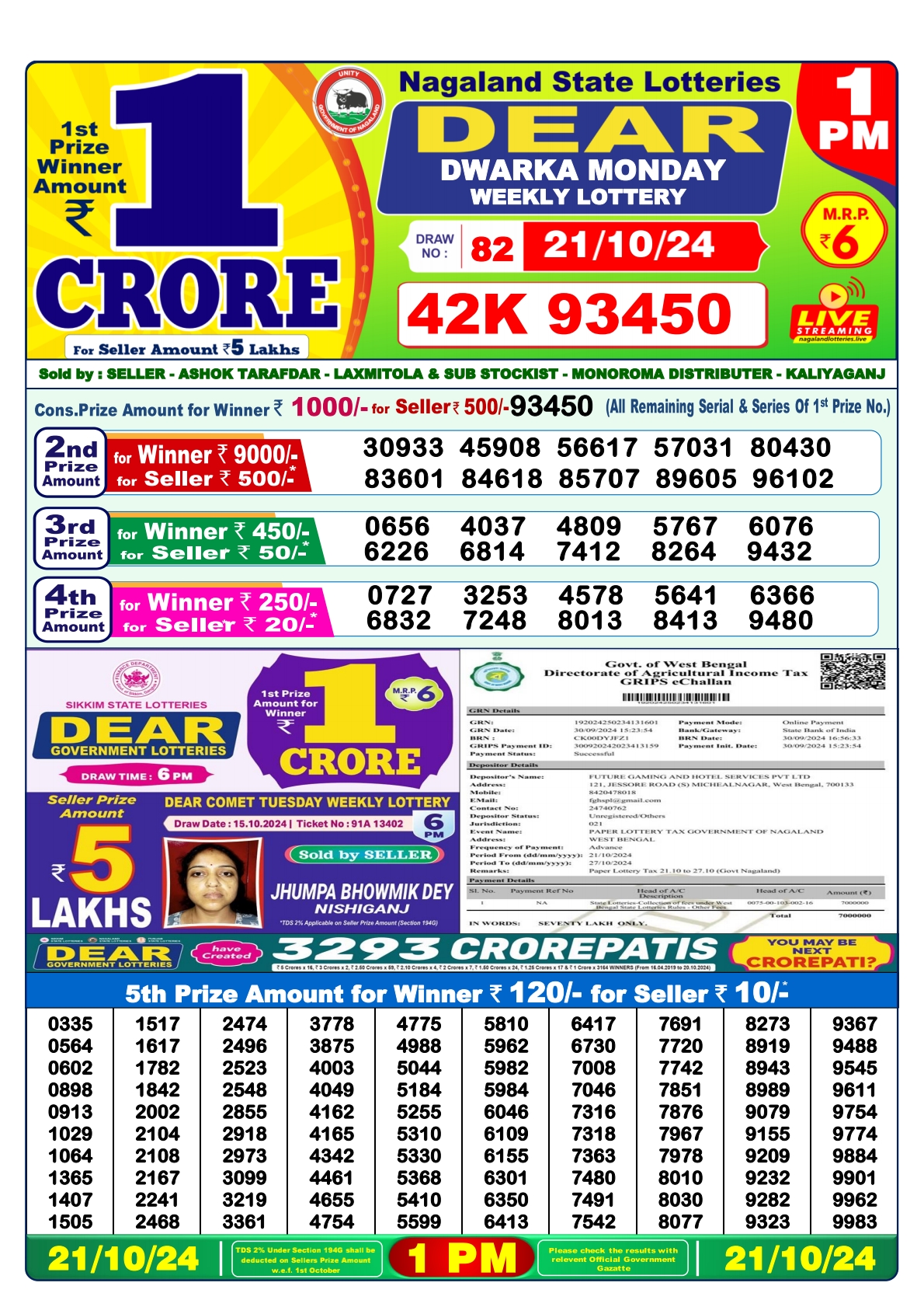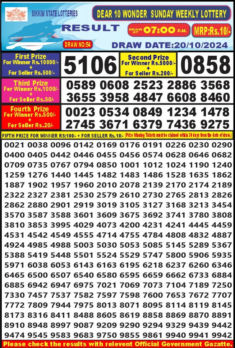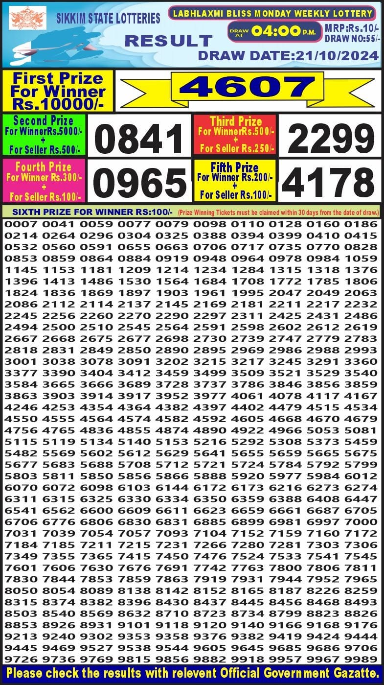 Dear 10 blue lottery 1.30PM Result 21/10/24