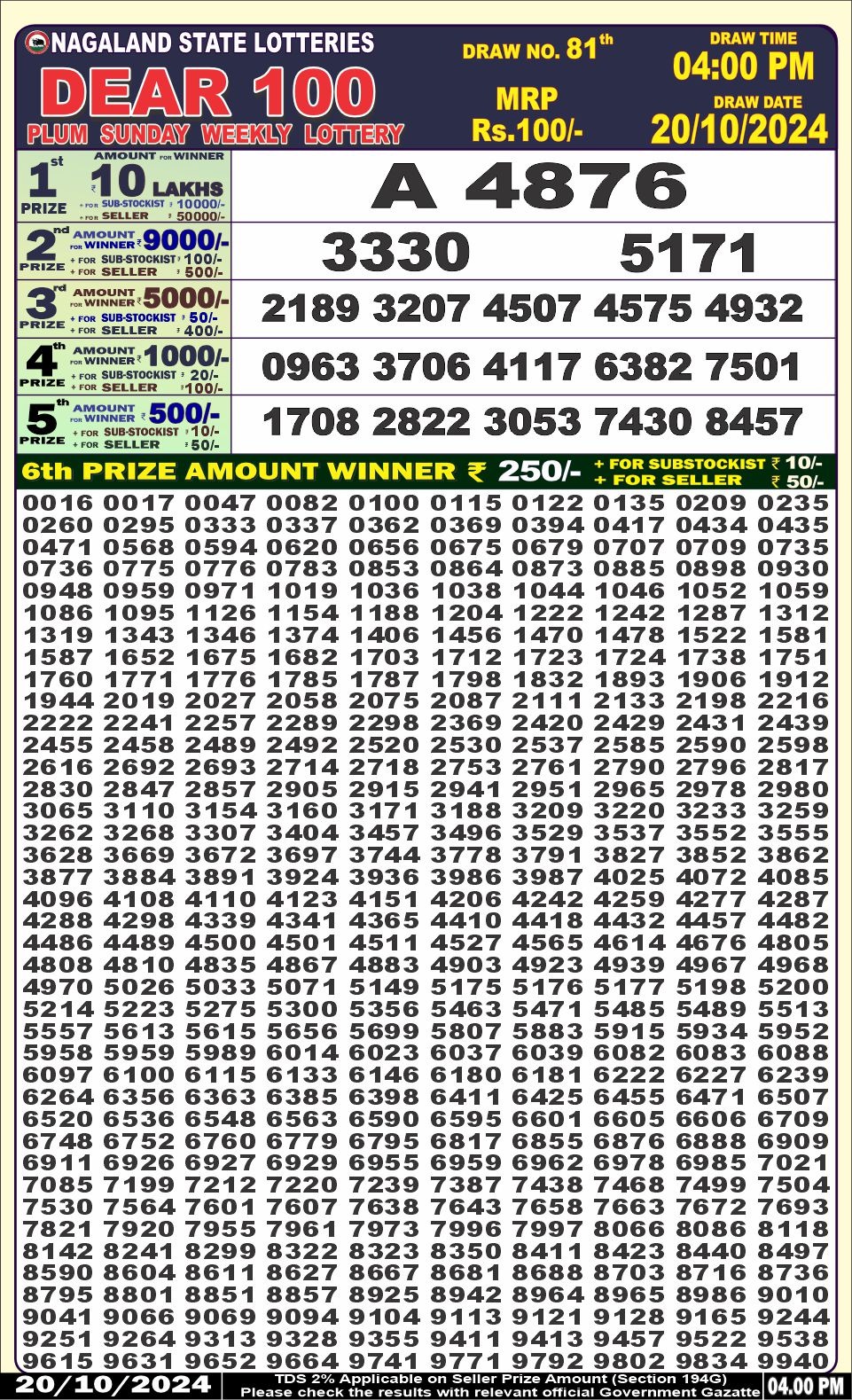 Dear 100 plum sunday  Lottery 4pm Result  20.10.2024