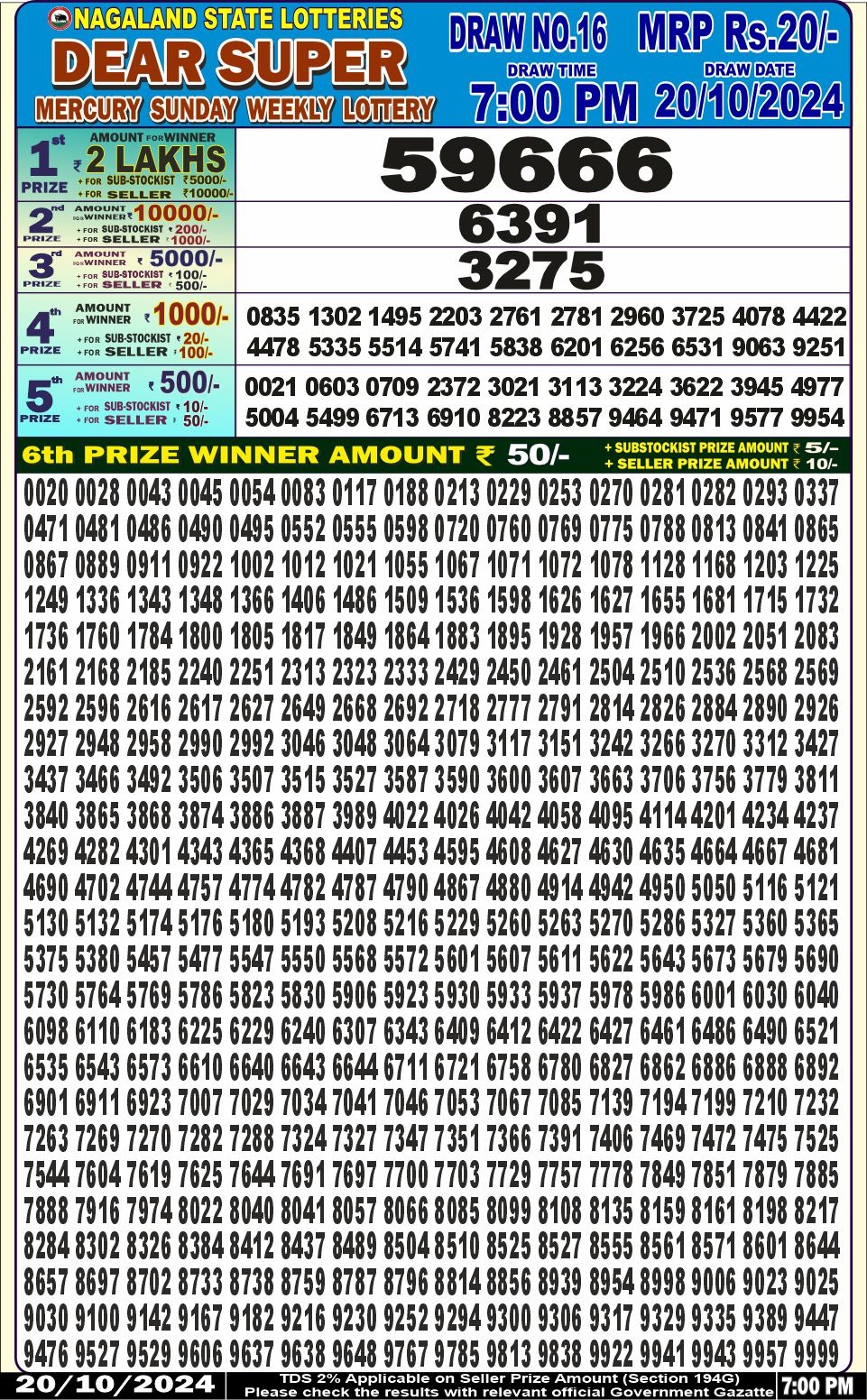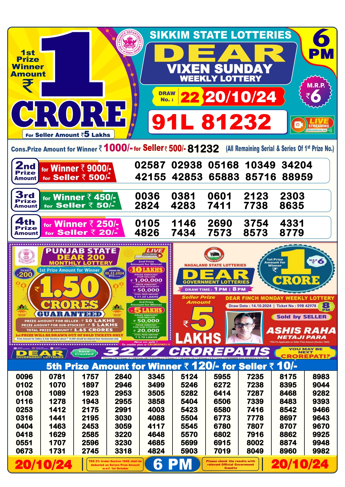 Dear vixen sunday  weekly  6PM Result 20.10.24
