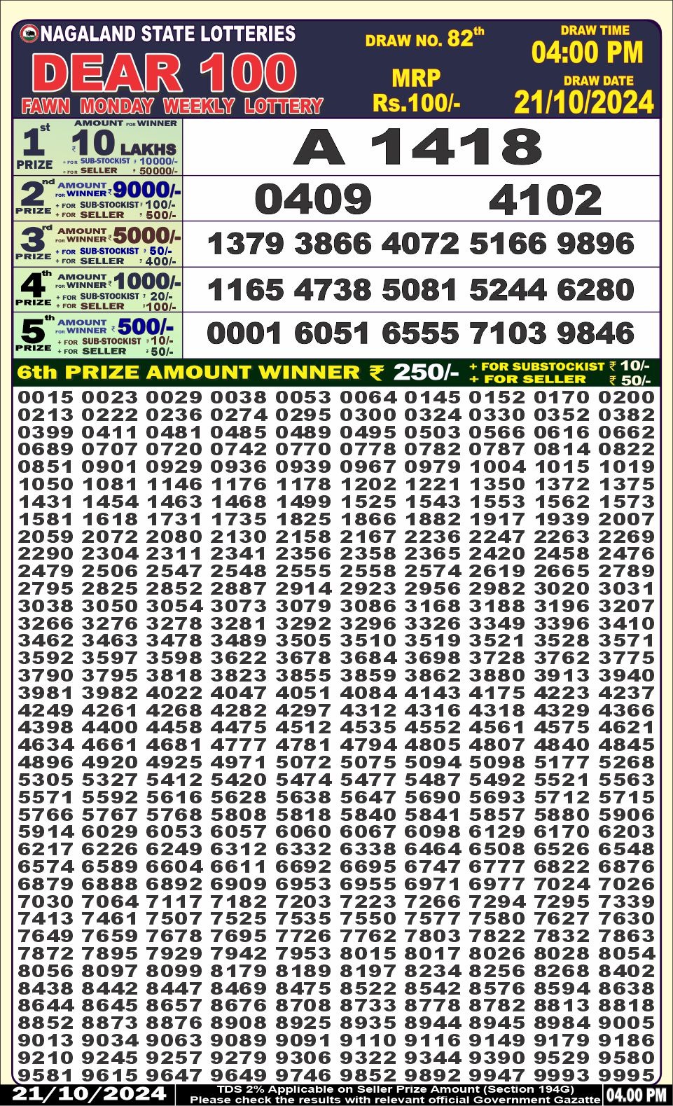 Dear 100 fawn monday  Lottery 4pm Result  21.10.2024