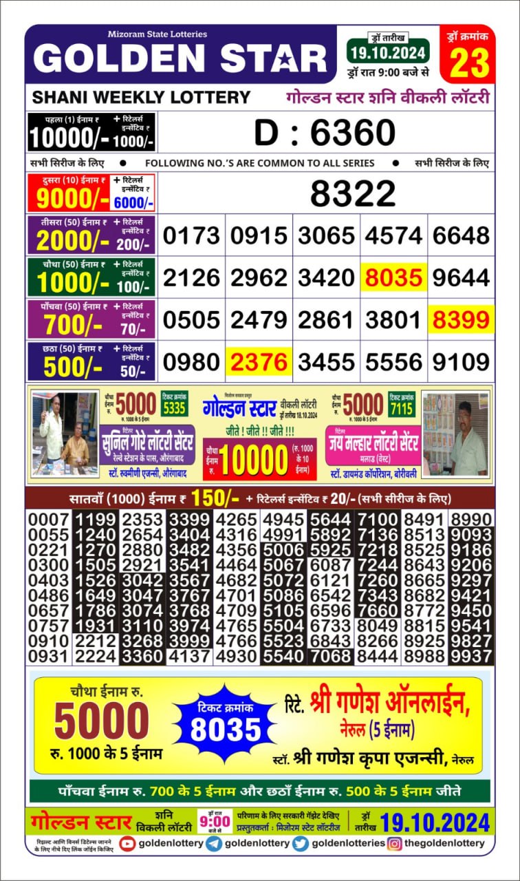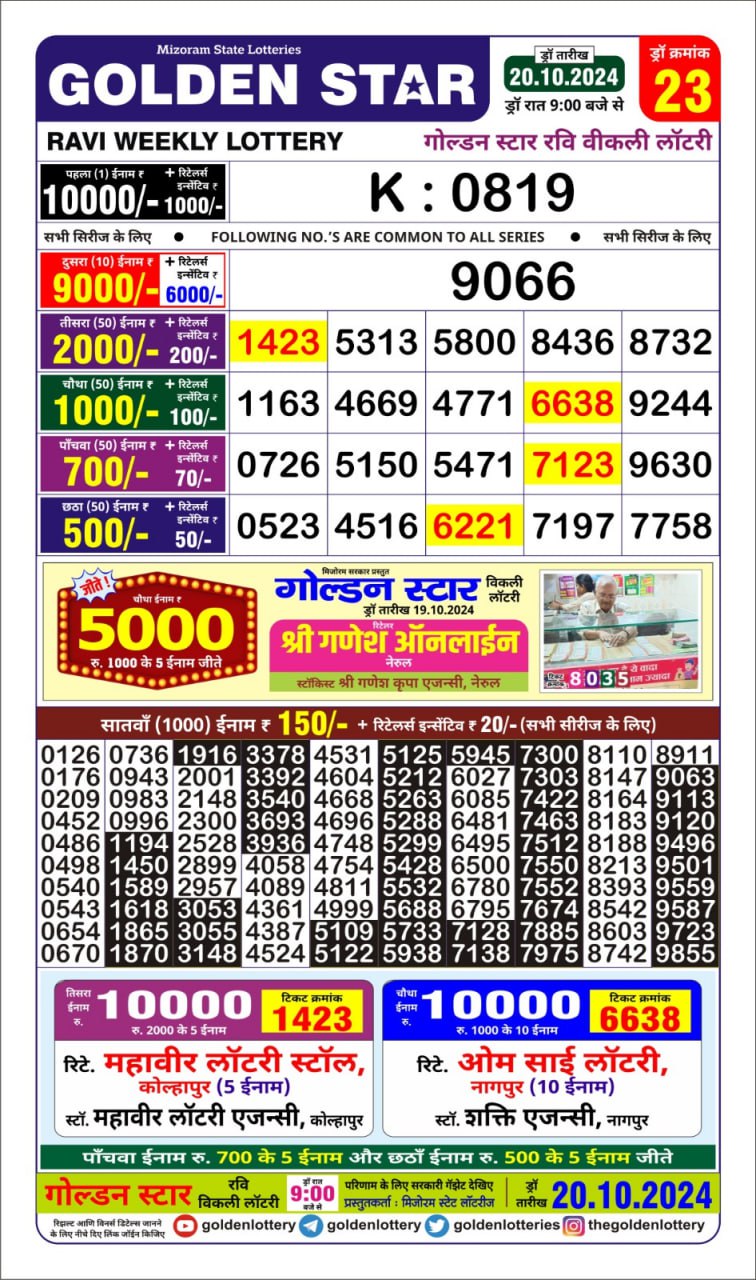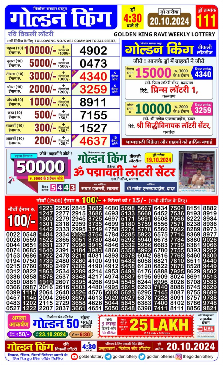 Golden king  weekly lottery 4.30pm result 20.10.24
