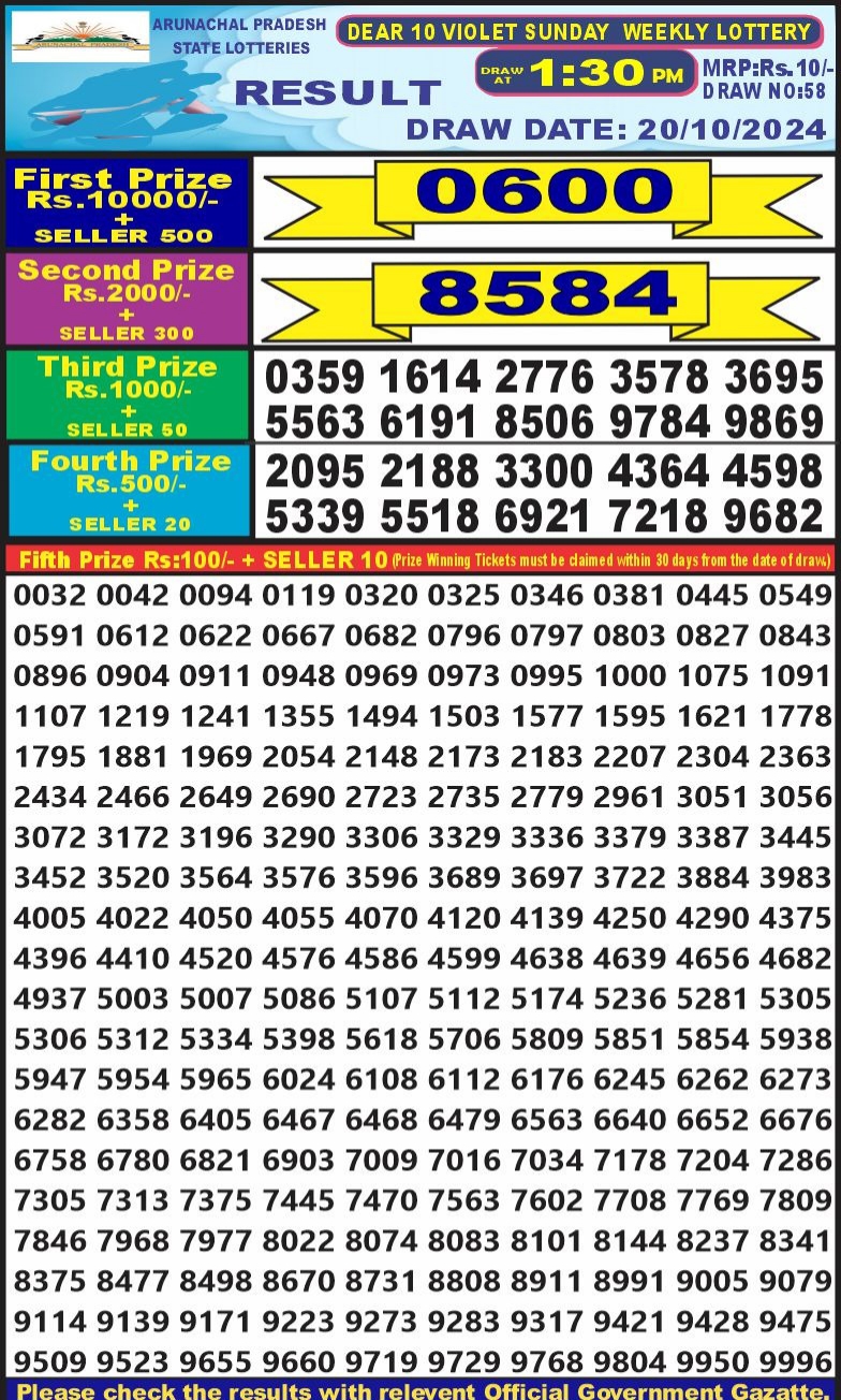 Dear 10  violet lottery 1.30PM Result 20/10/24