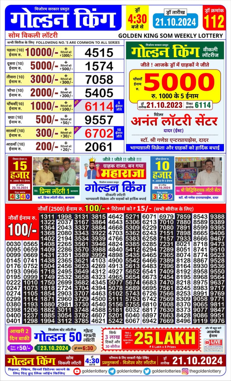Golden king  weekly lottery 4.30pm result 21.10.24