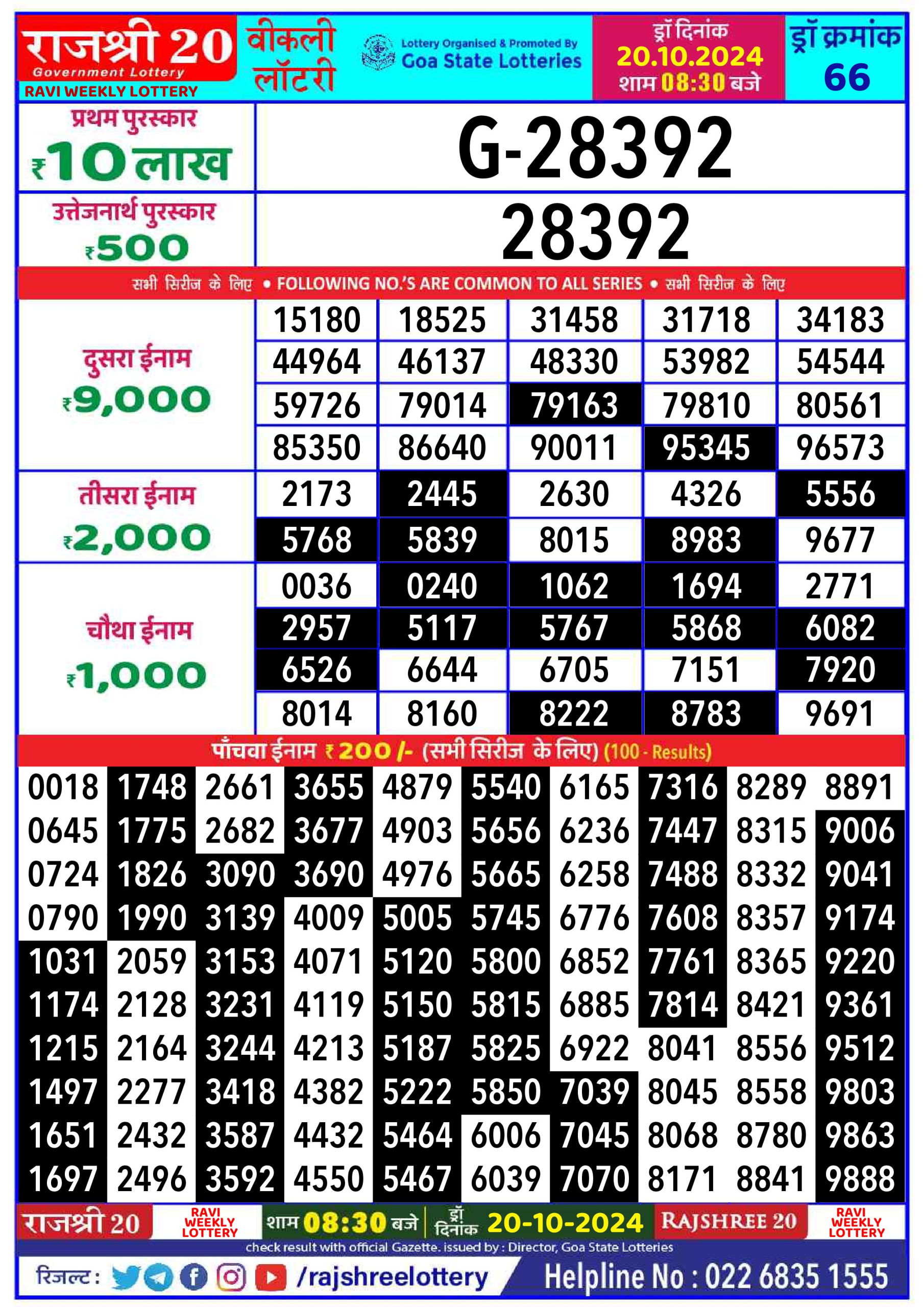 Rajshree 20  weekly 8:30pm Lottery result 20.10.24