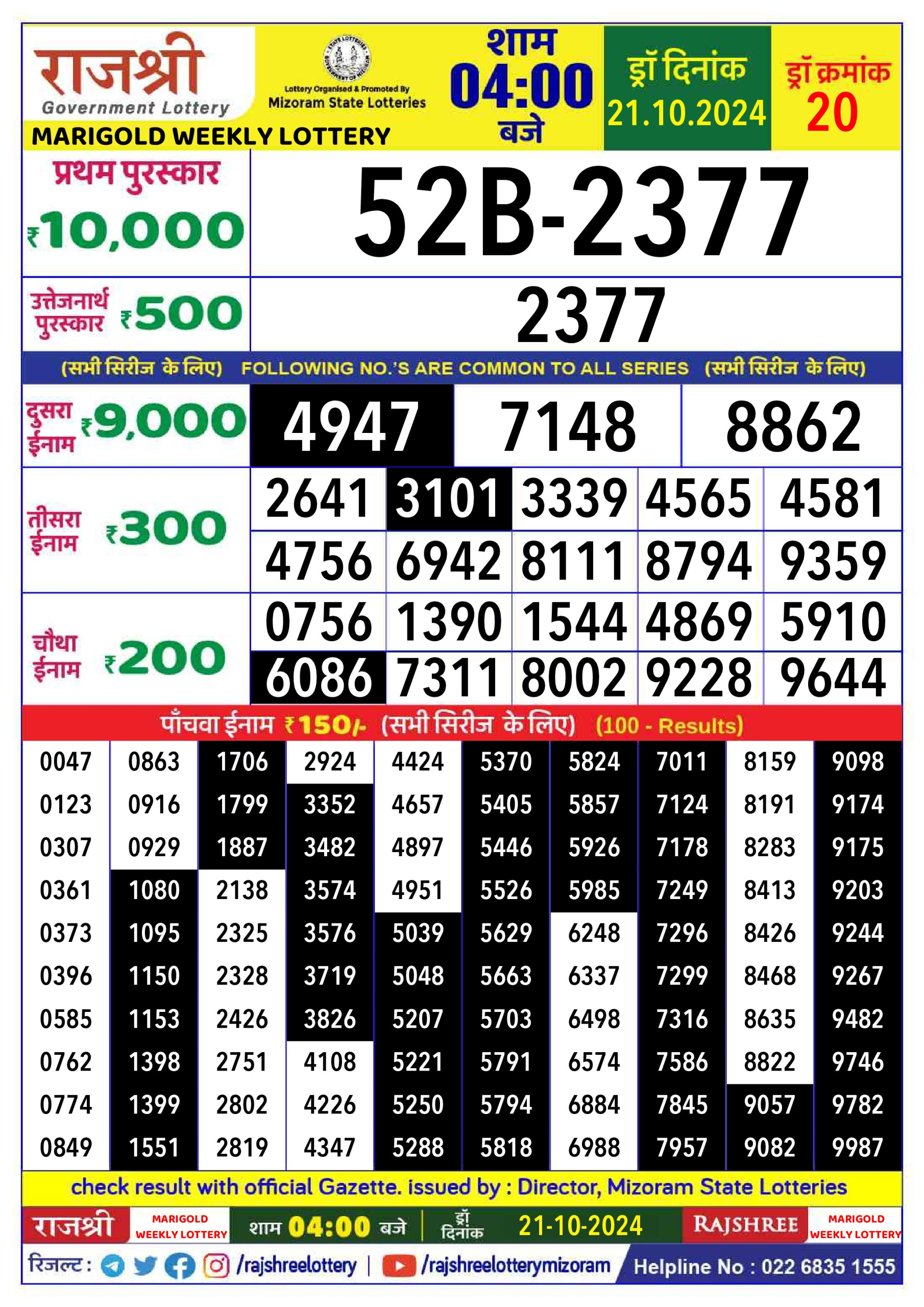 Rajshree marigold Weekly Lottery 4PM Result 21.10.24