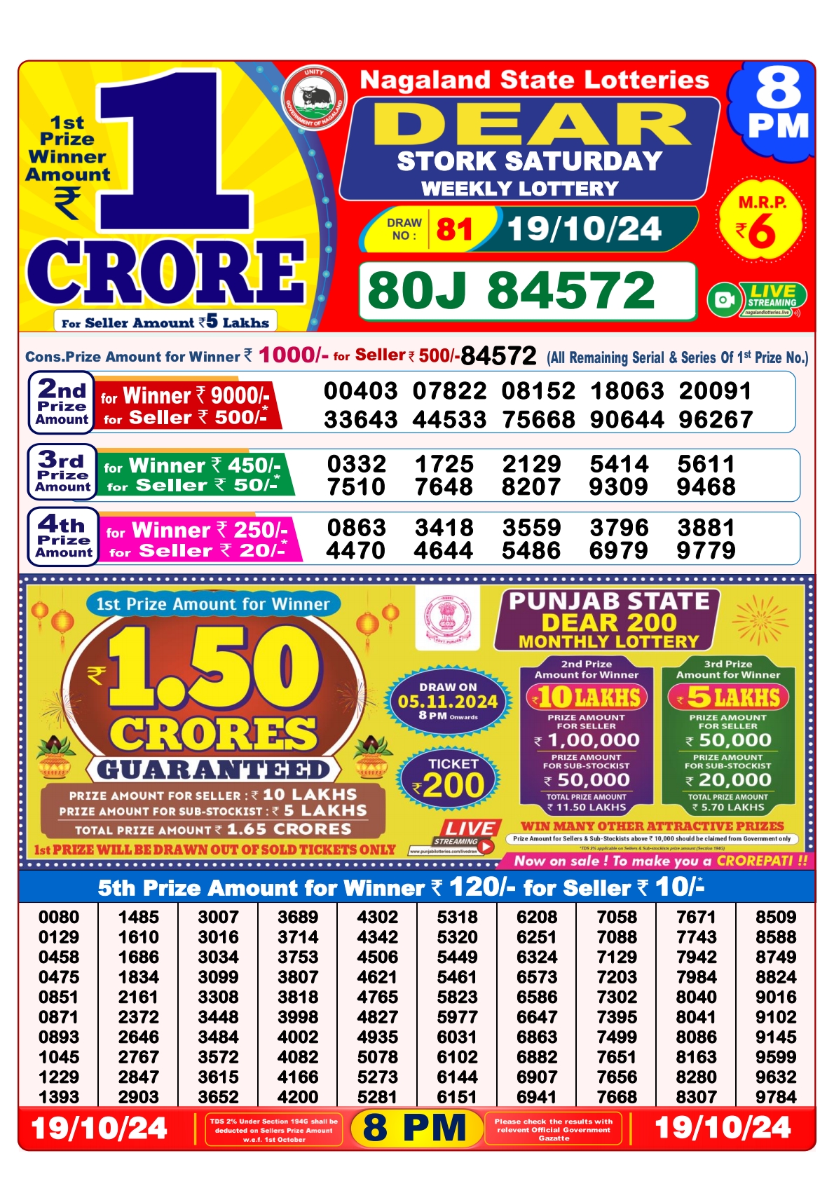 Dear stork Weekly Lottery 8PM Result 19.10.24