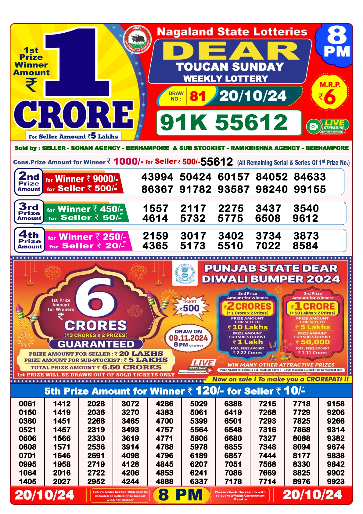 Dear  toucan Weekly Lottery 8PM Result 20.10.24