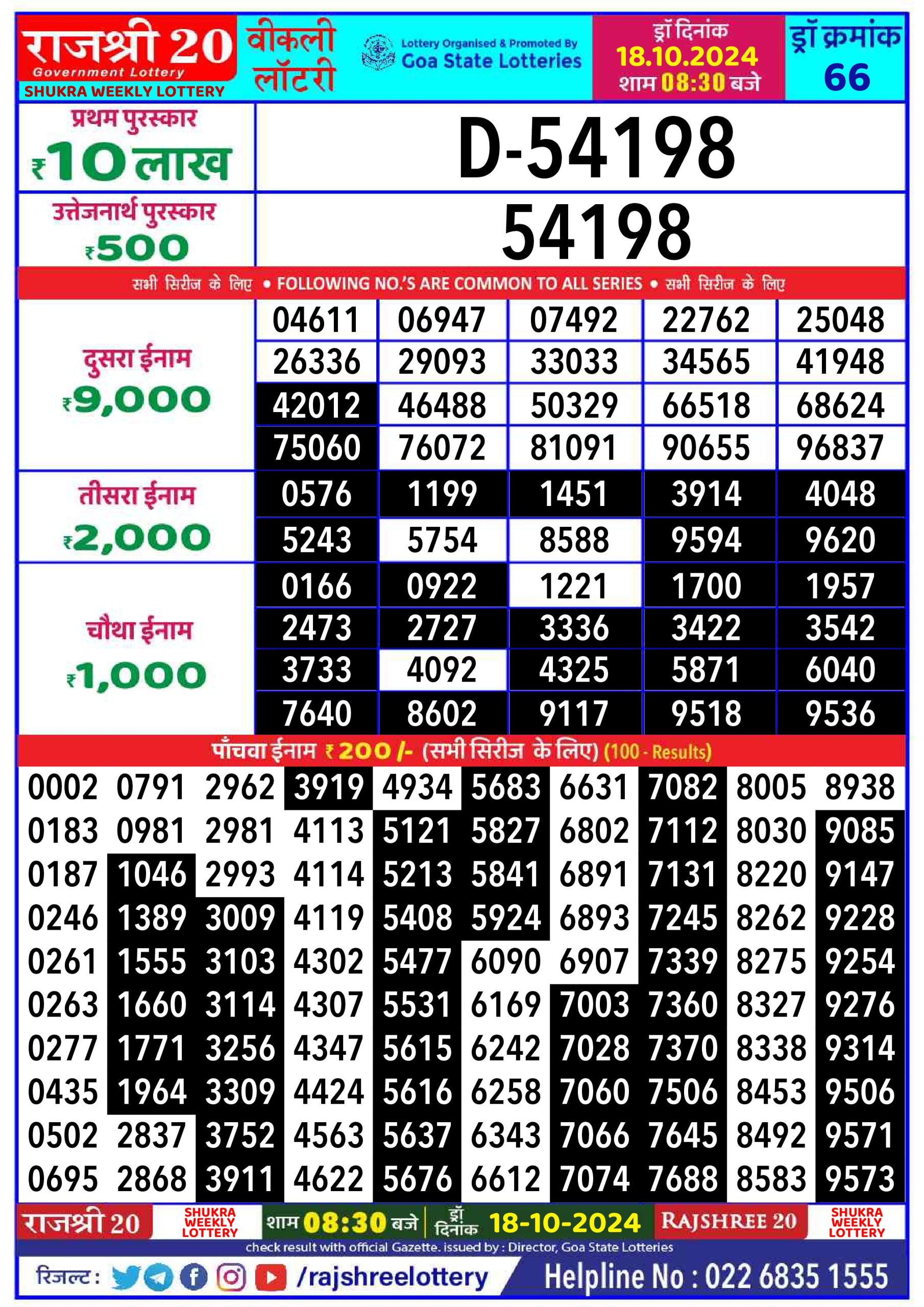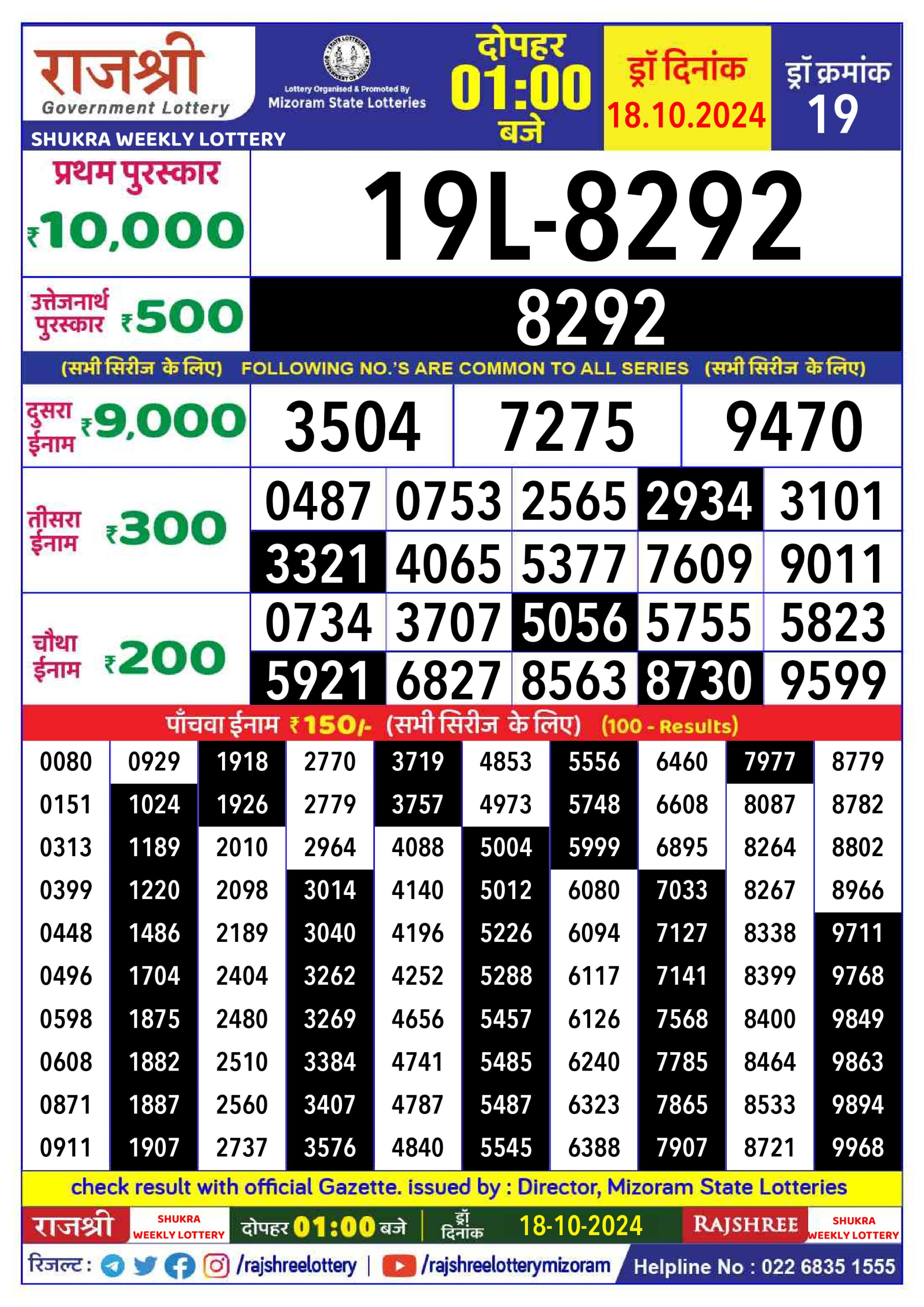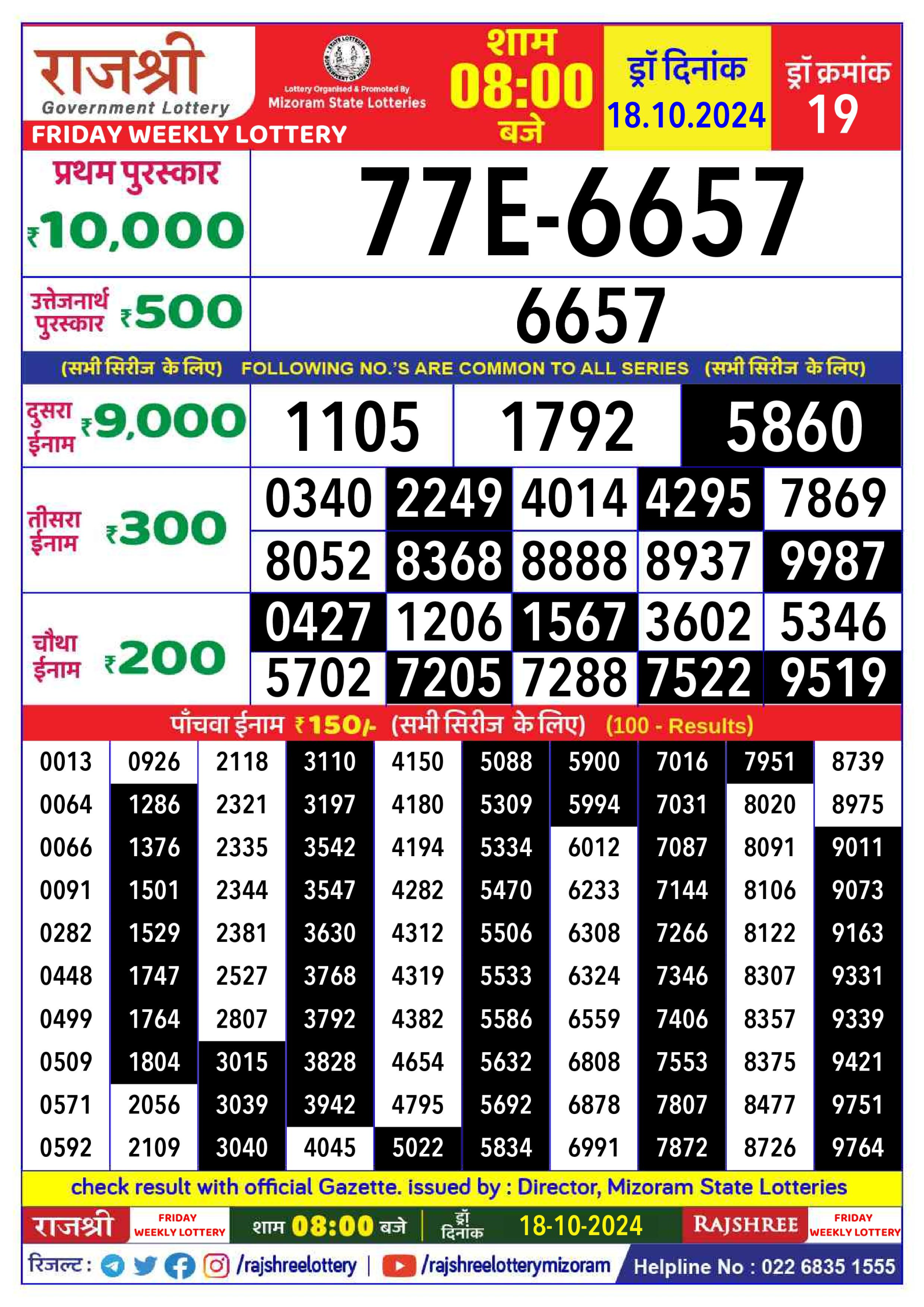 Rajshree shukra friday  Weekly Lottery 1PM Result 18.10.24