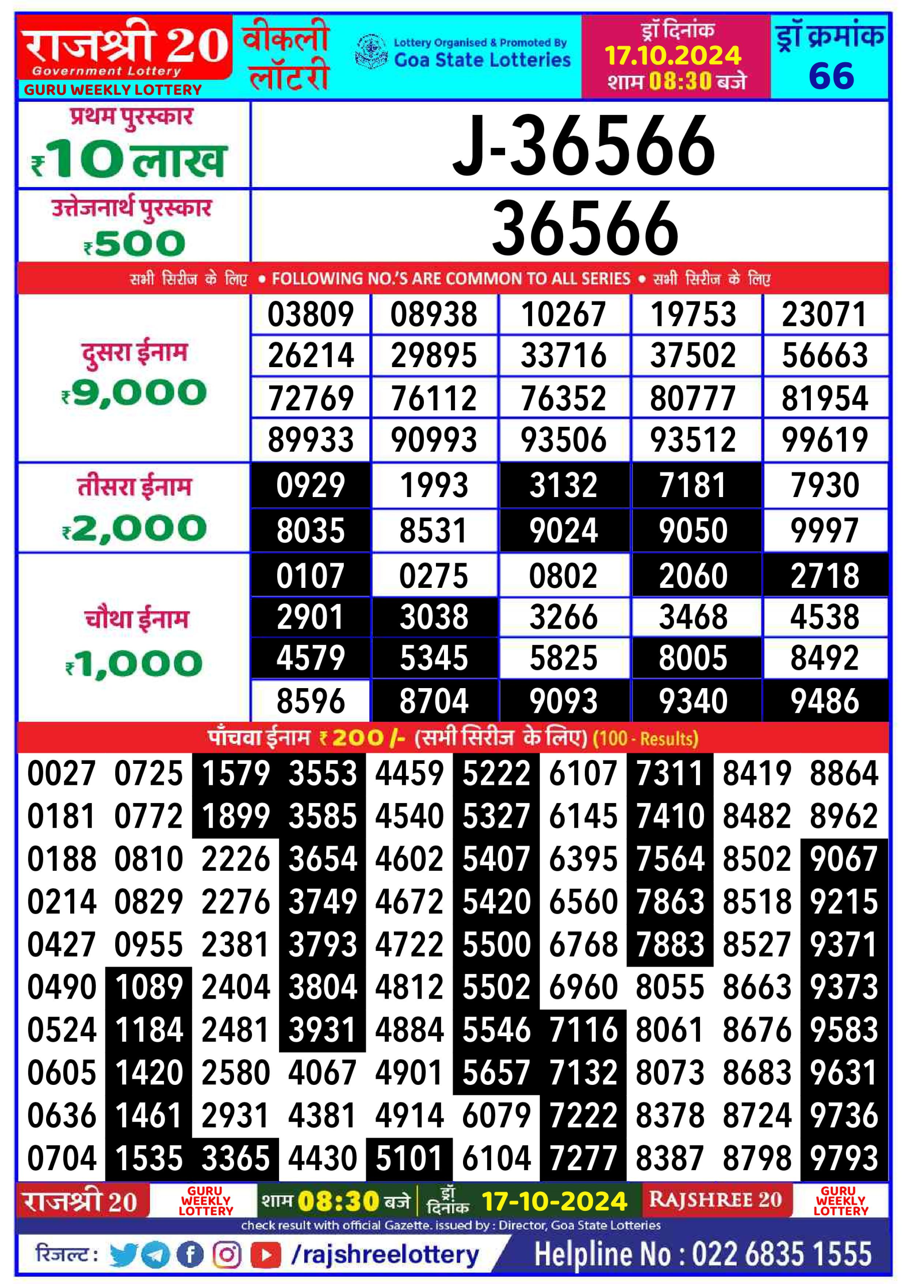 Rajshree 20  weekly 8:30pm Lottery result 17.10.24