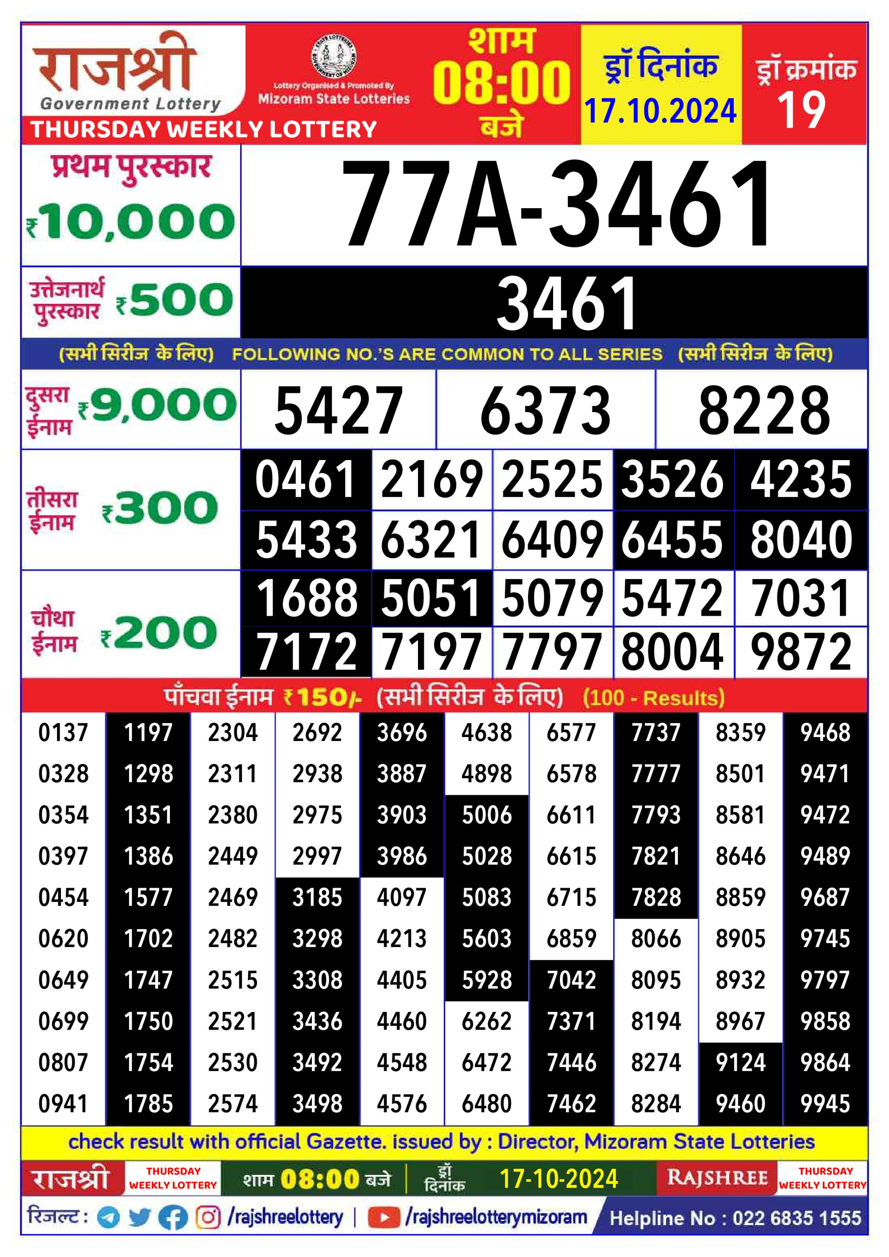 Rajshree  Weekly Lottery 8PM Result 17.10.24