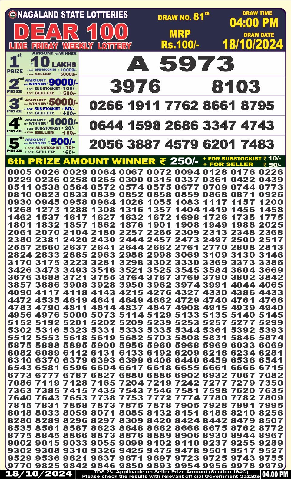 Dear 100 lime friday  Lottery 4pm Result  18.10.2024