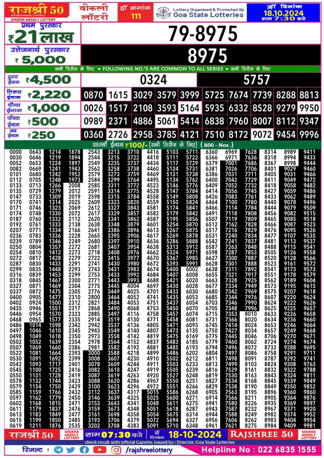 Rajshree 50  Lottery 7:30PM Result 18.10.24
