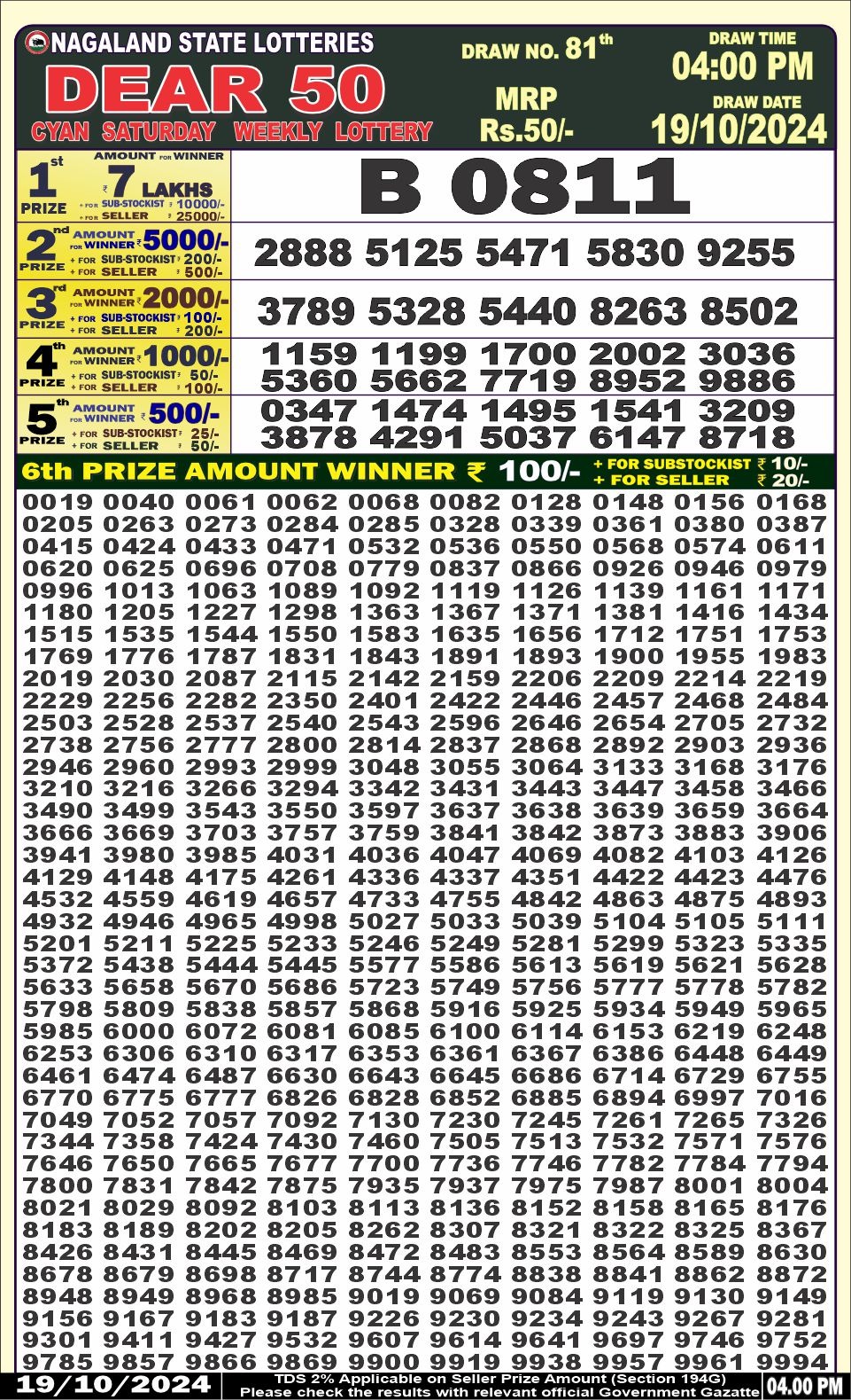 Dear 50 cyan saturday  Lottery 4pm Result  19.10.2024