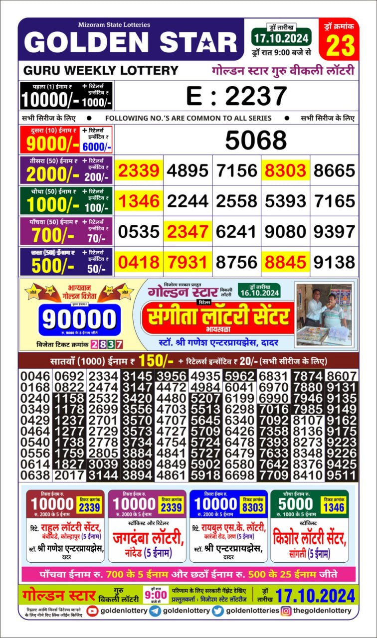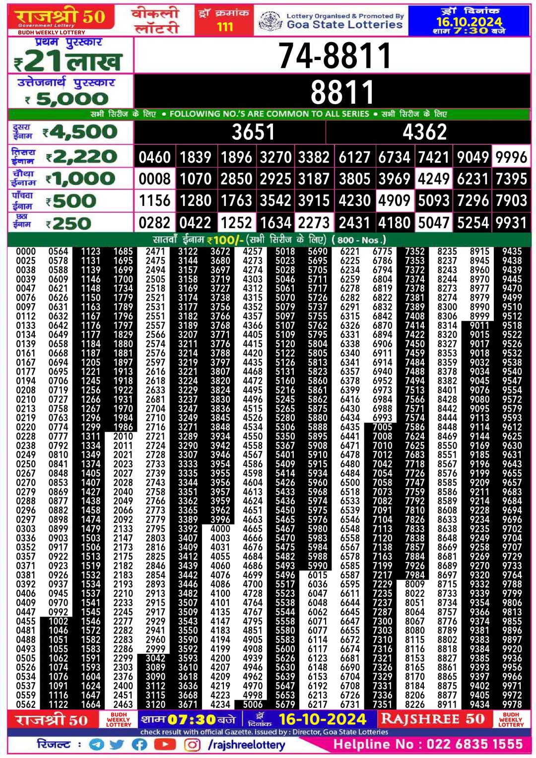 Rajshree 50  Lottery 7:30PM Result 17.10.24