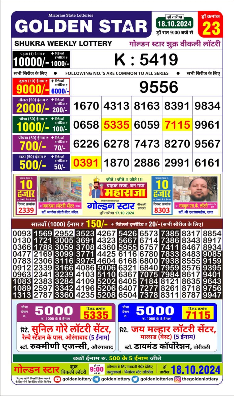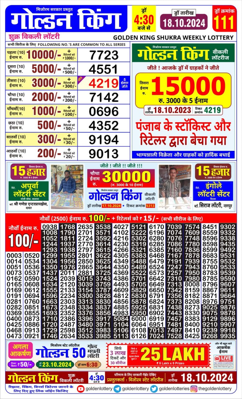 Golden king  weekly lottery 4.30pm result 18.10.24