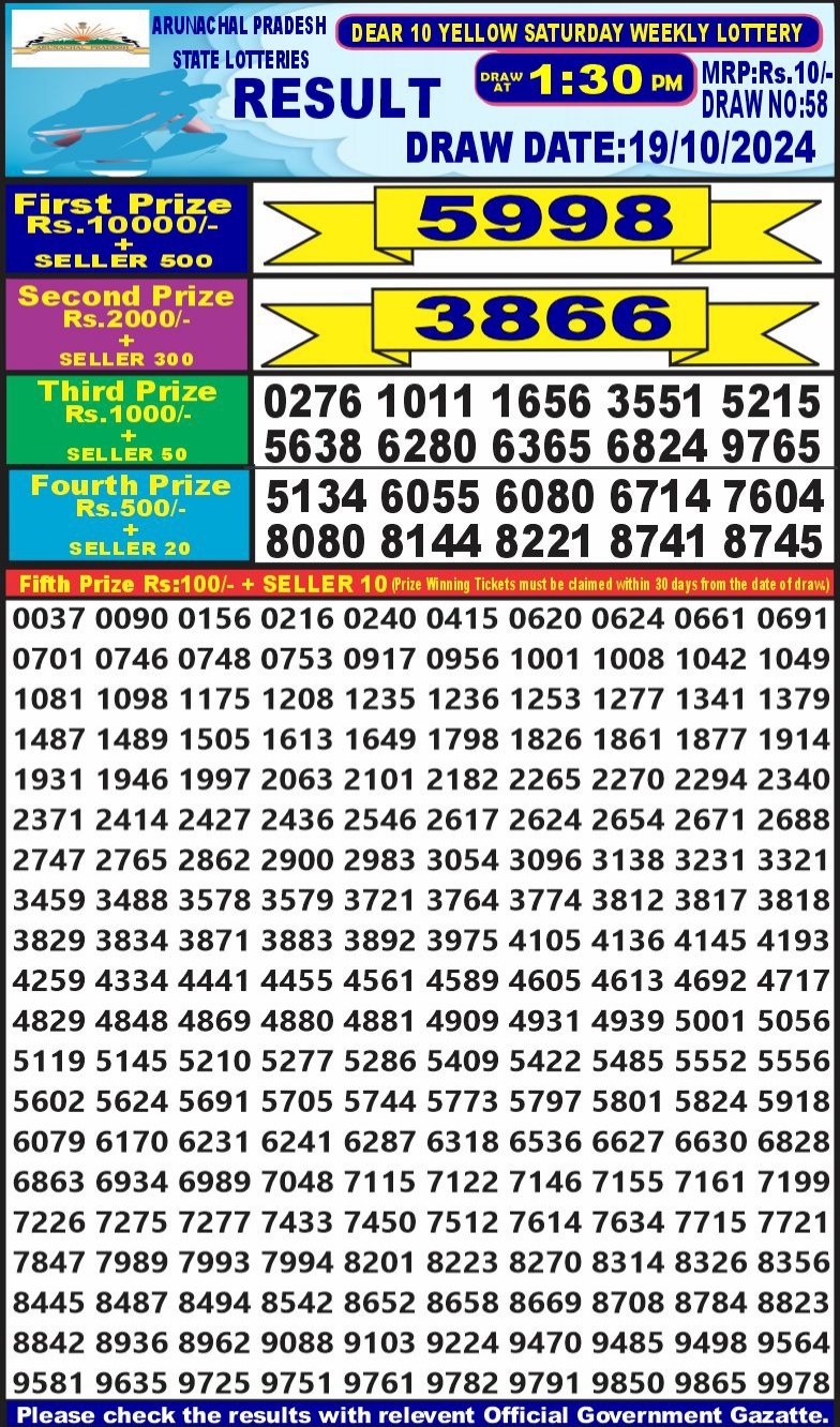 Dear 10  yellow lottery 1.30PM Result 19/10/24