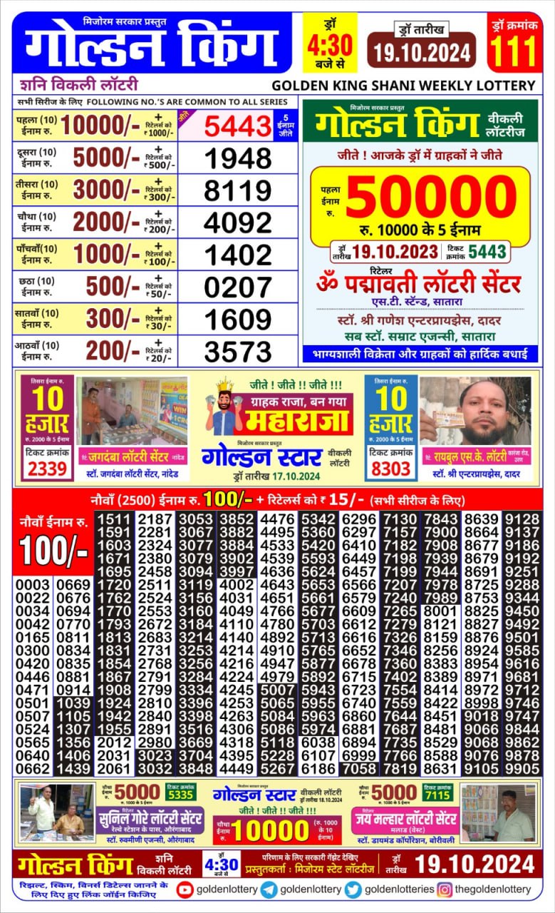 Golden king  weekly lottery 4.30pm result 19.10.24
