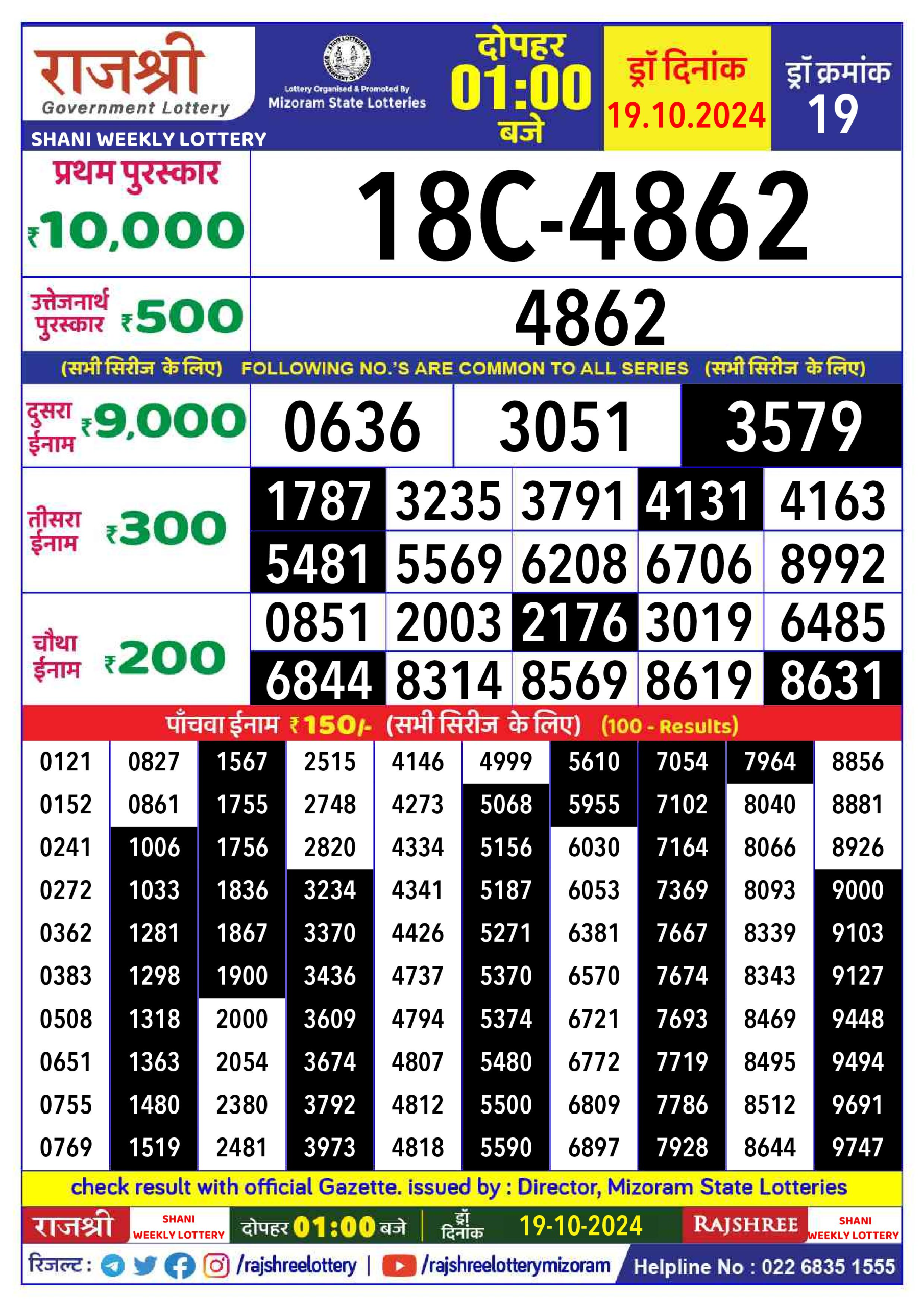 Rajshree shani saturday  Weekly Lottery 1PM Result 19.10.24