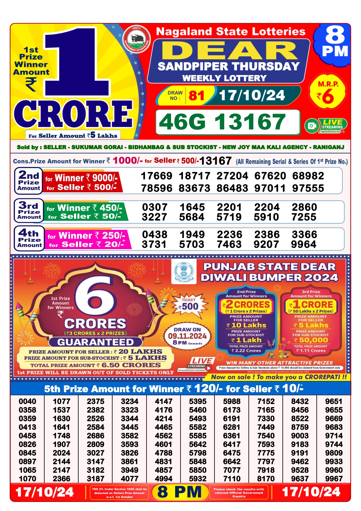 Dear sandpiper Weekly Lottery 8PM Result 17.10.24