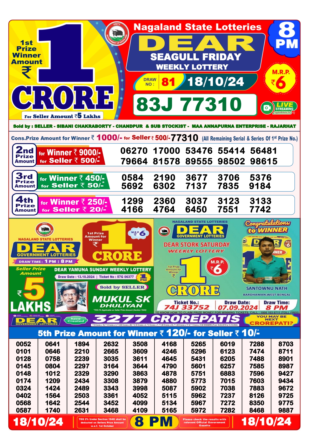 Dear seagull Weekly Lottery 8PM Result 18.10.24