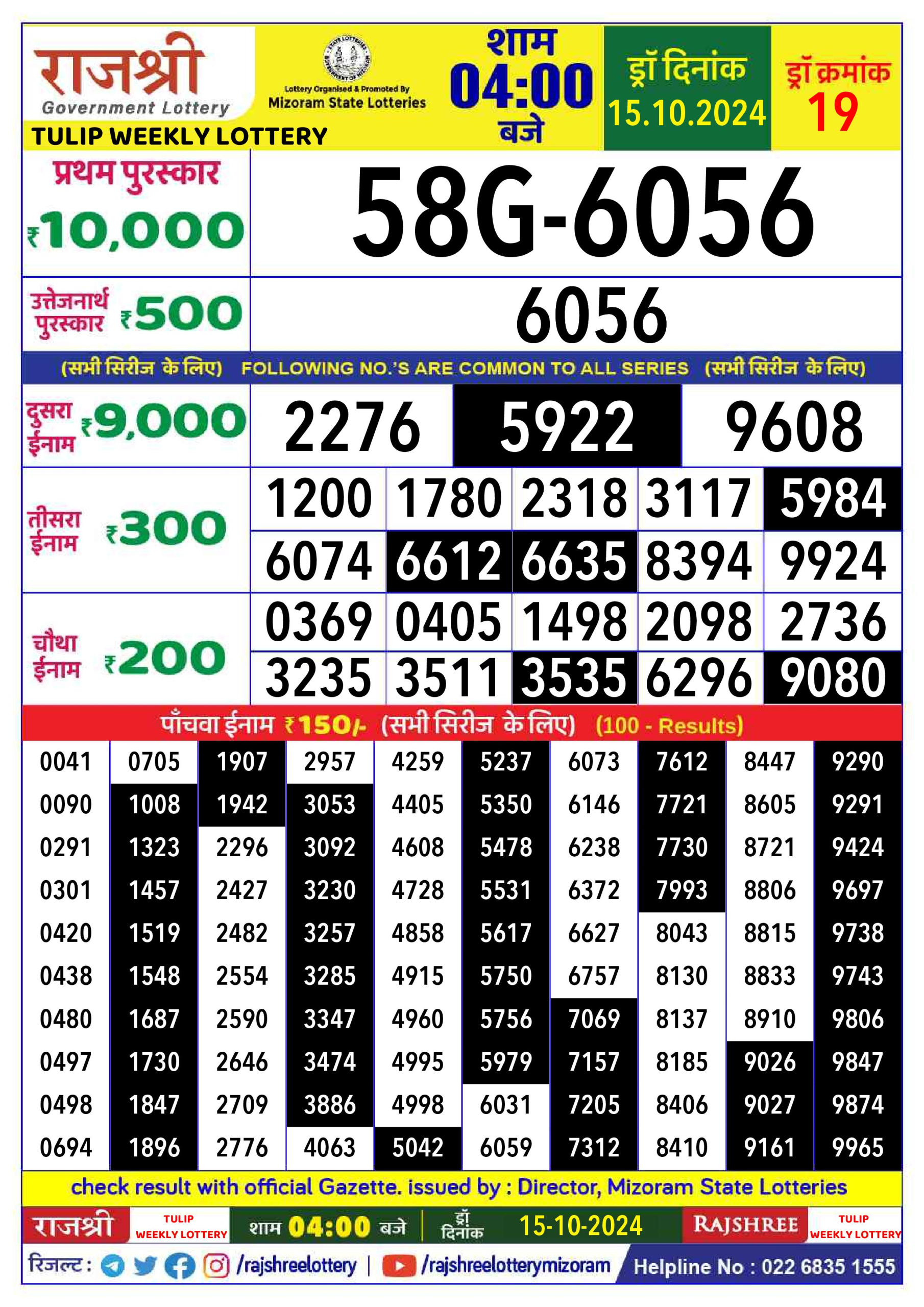 Rajshree tulip Weekly Lottery 4PM Result 15.10.24