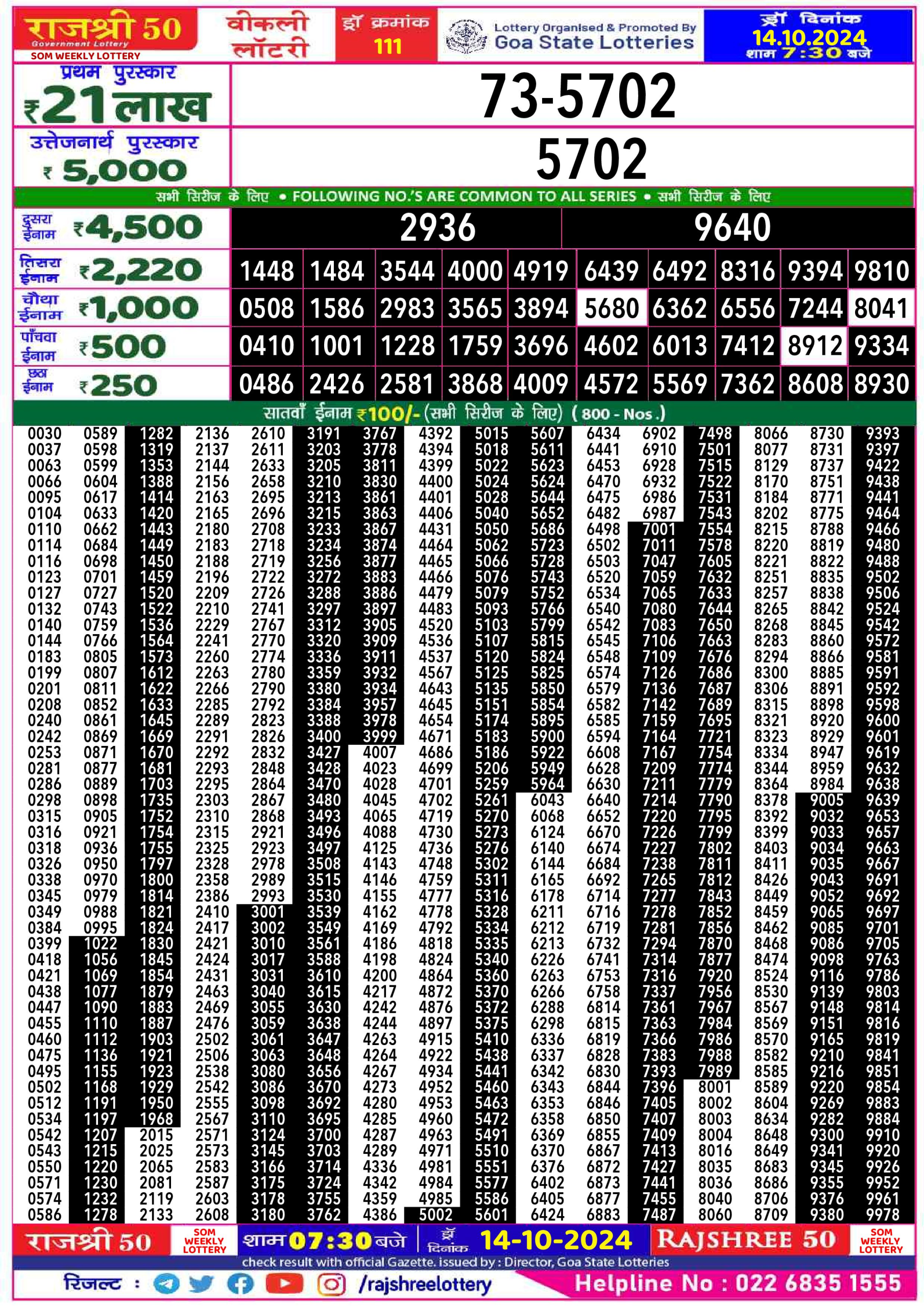 Rajshree 50  Lottery 7:30PM Result 14.10.24
