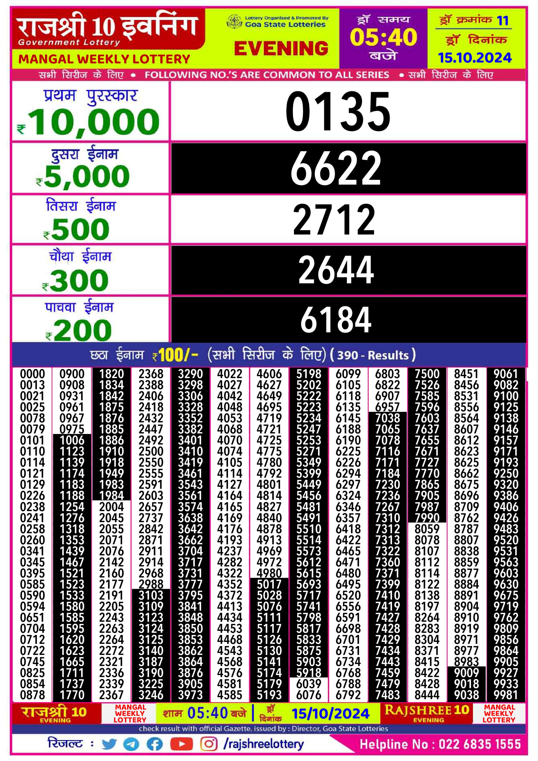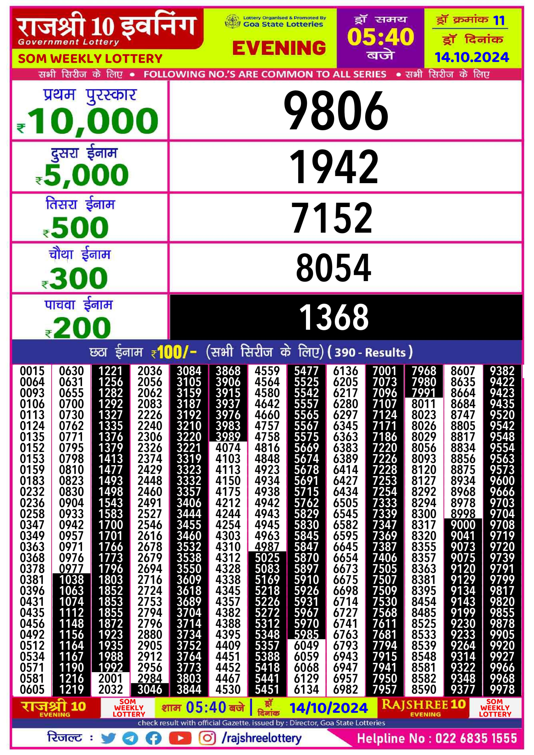 Rajshree 10 evening som monday  5:40pm result 14.10.24