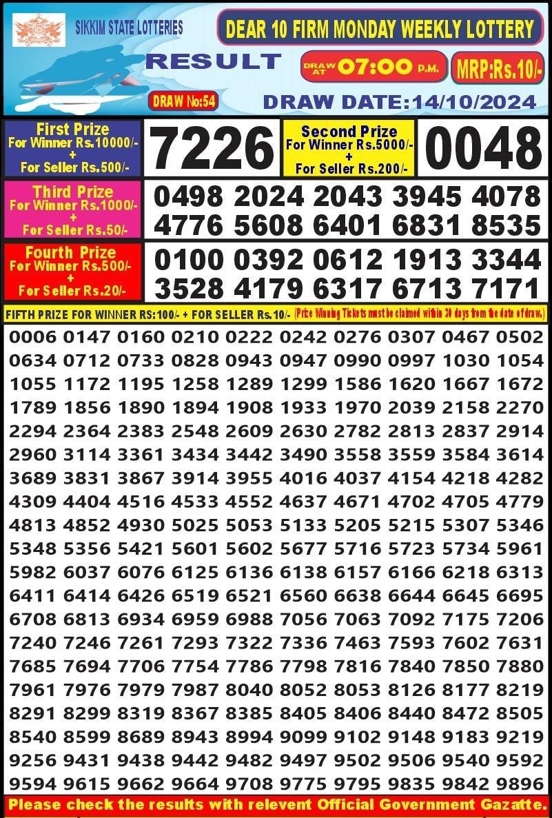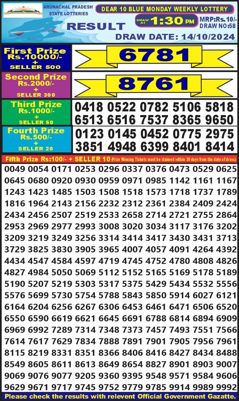 Dear 10 blue lottery 1.30PM Result 14/10/24