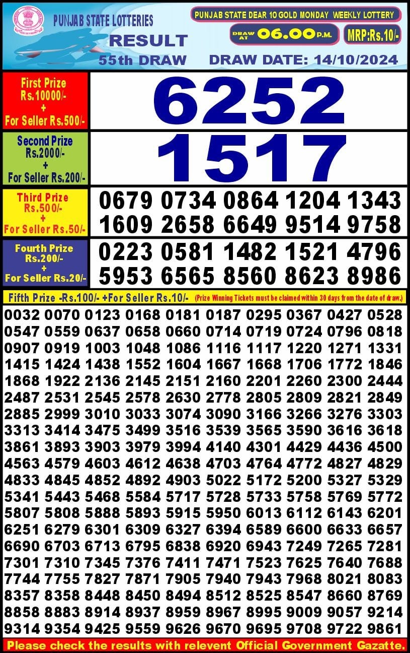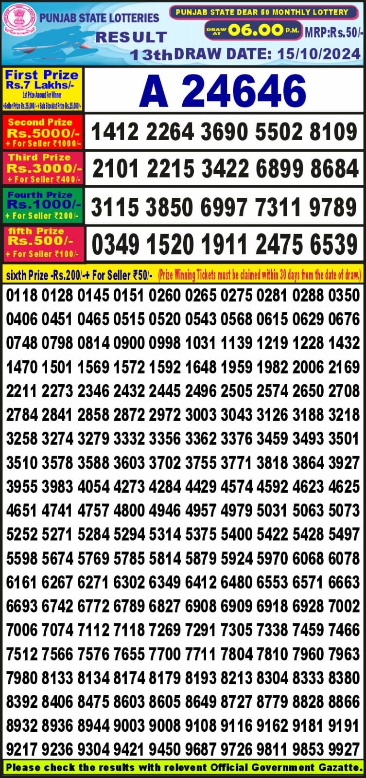 Punjab state dear 50 monthly Lottery result 15.10.24