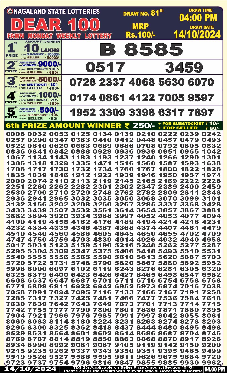 Dear 100 fawn monday  Lottery 4pm Result  14.10.2024