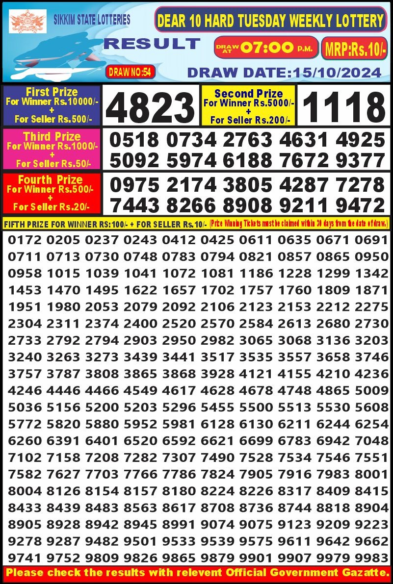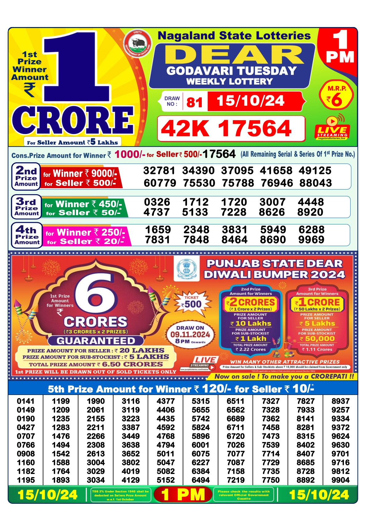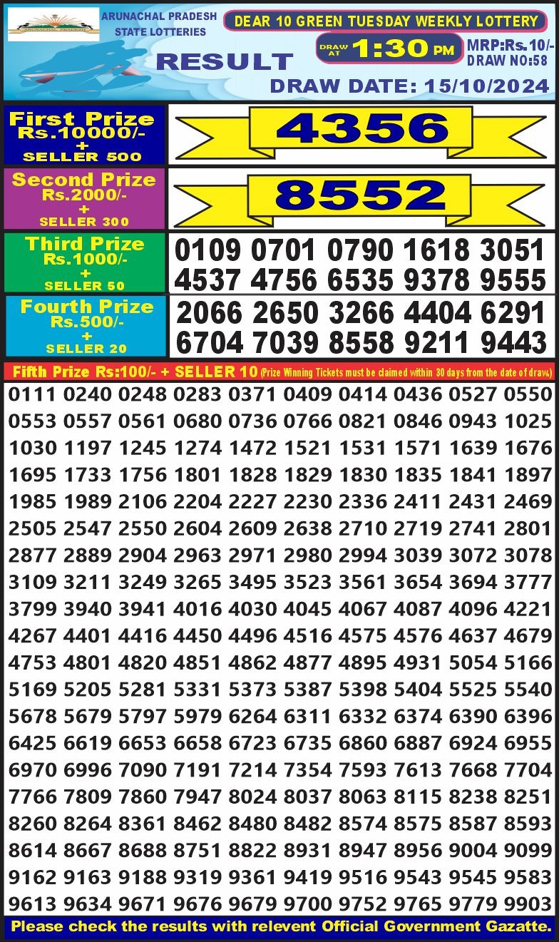 Dear 10 green lottery 1.30PM Result 15/10/24