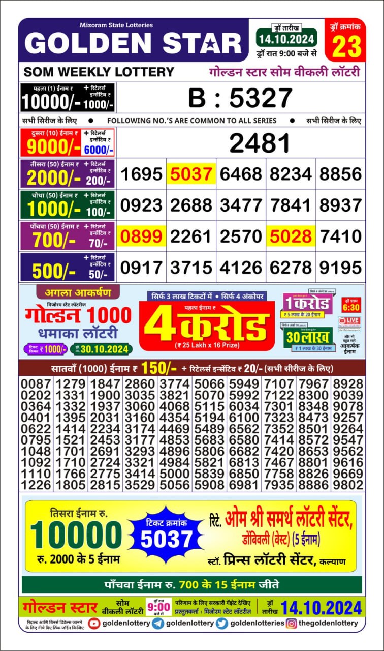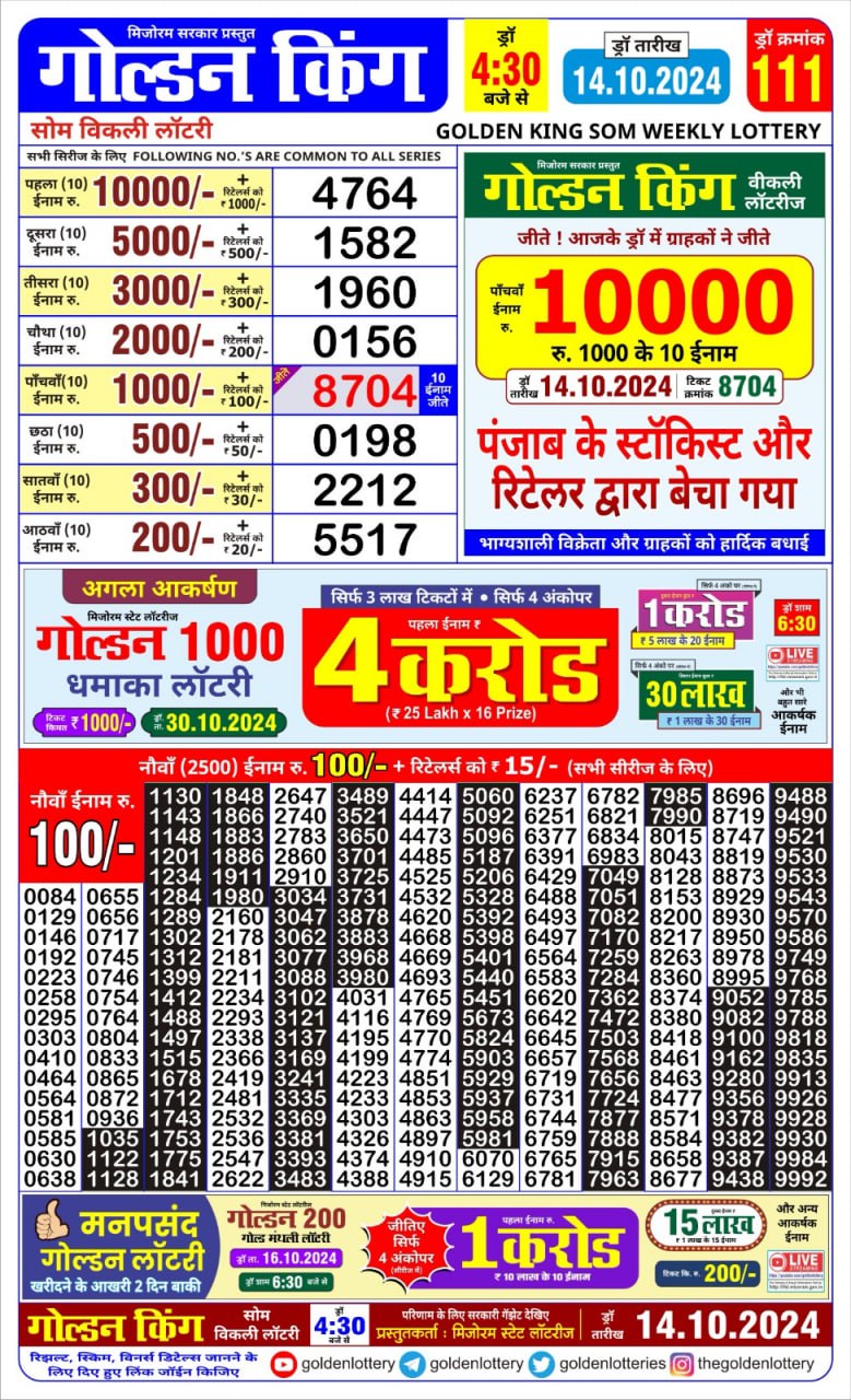 Golden king  weekly lottery 4.30pm result 14.10.24