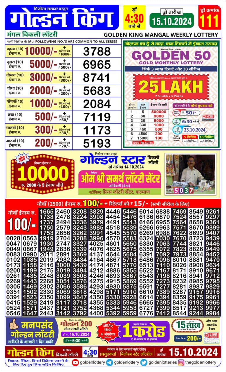 Golden king  weekly lottery 4.30pm result 15.10.24