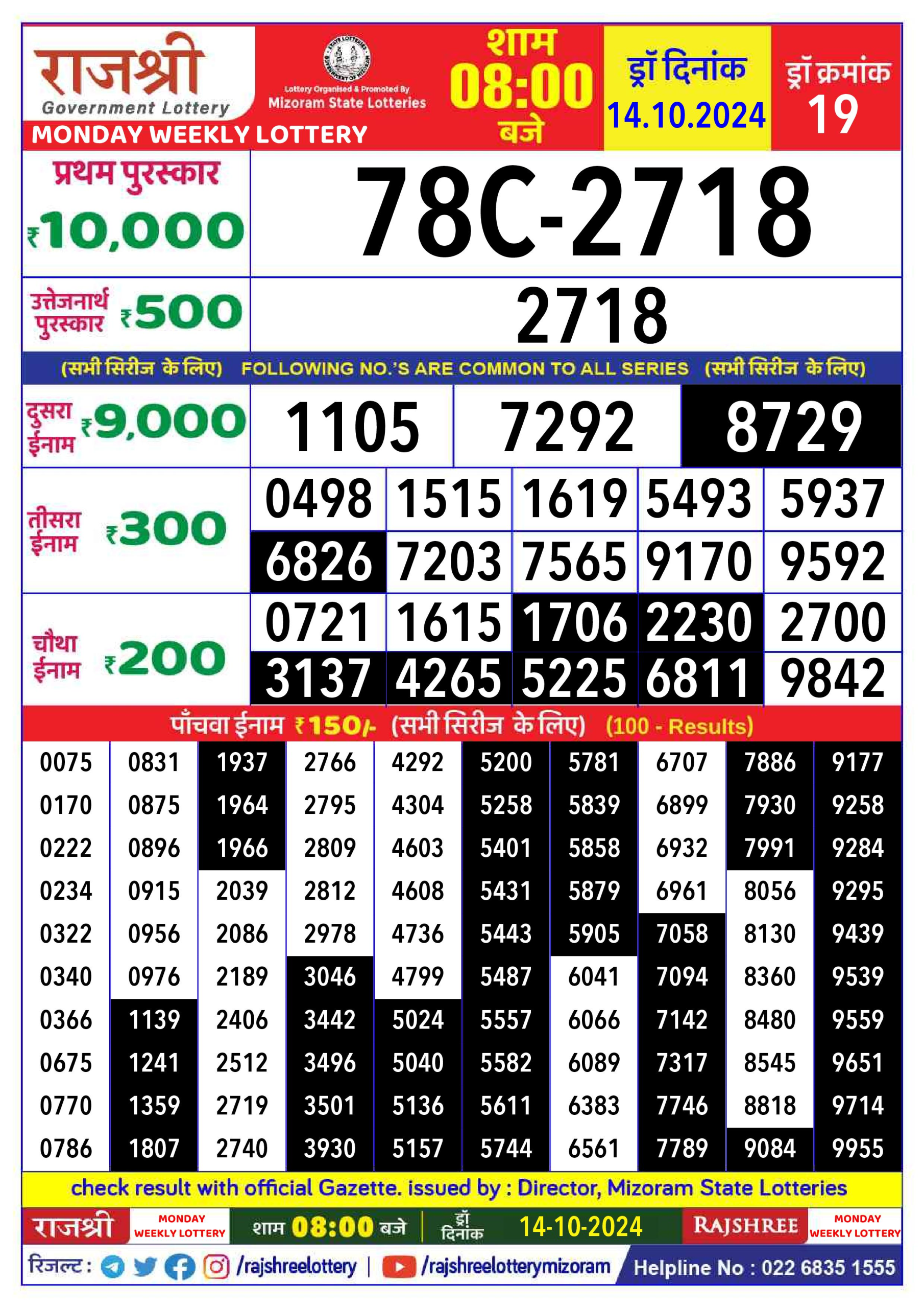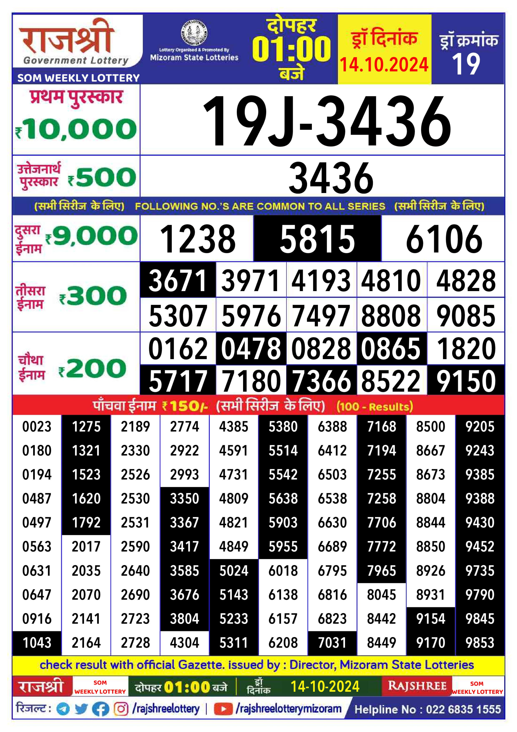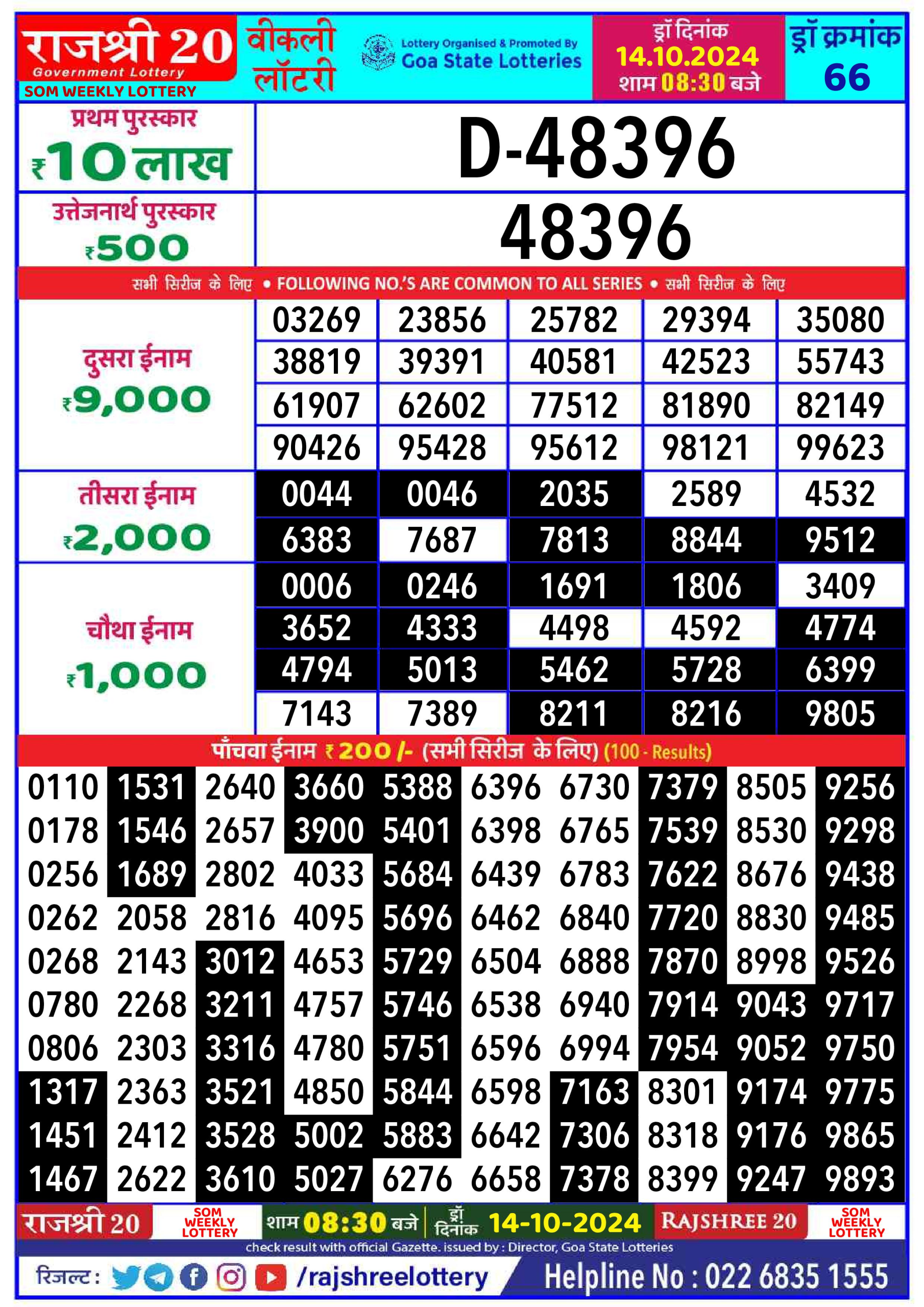 Rajshree som monday  Weekly Lottery 1PM Result 14.10.24