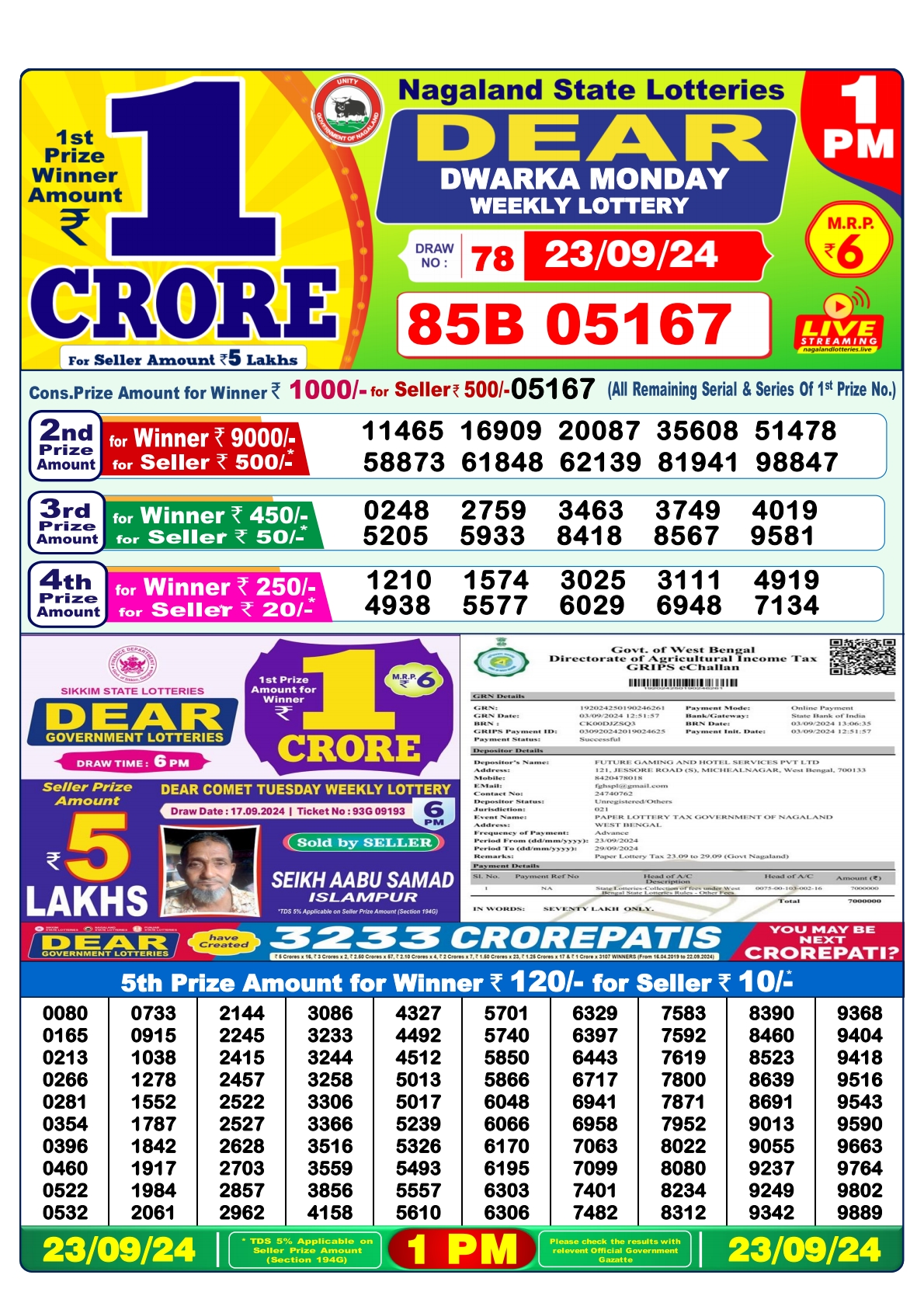 Dear dwarka Weekly 1pm result 23-09-24