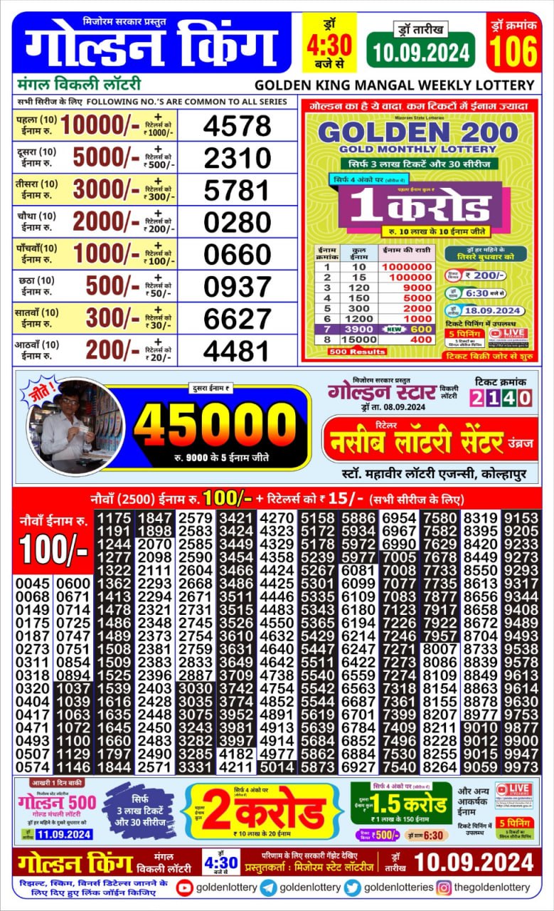 Golden king  weekly lottery 4.30pm result 10.9.24