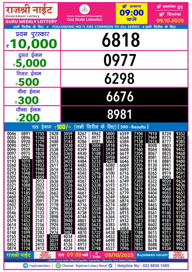 Rajshree Night Lottery 9pm Result 09.10.2025