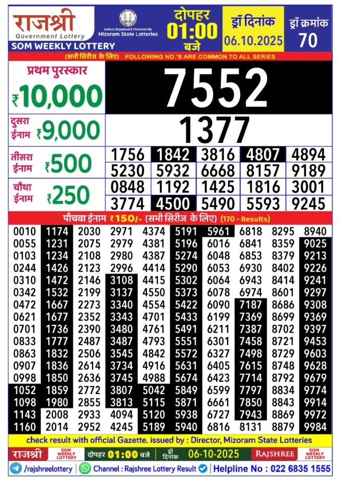 Rajshree Som Weekly Lottery 1pm Result 06.10.2025