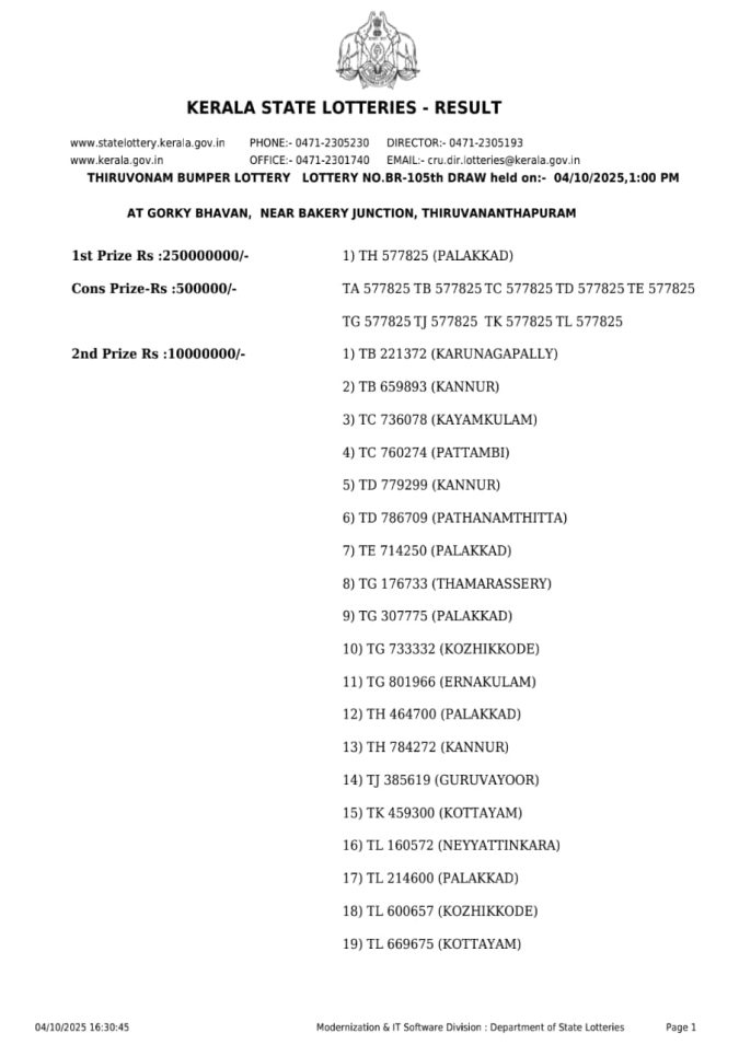 What’s the winning number? THIRUVONAM Bumper Result 10.04.2025 Kerala state Lottery Result Live update