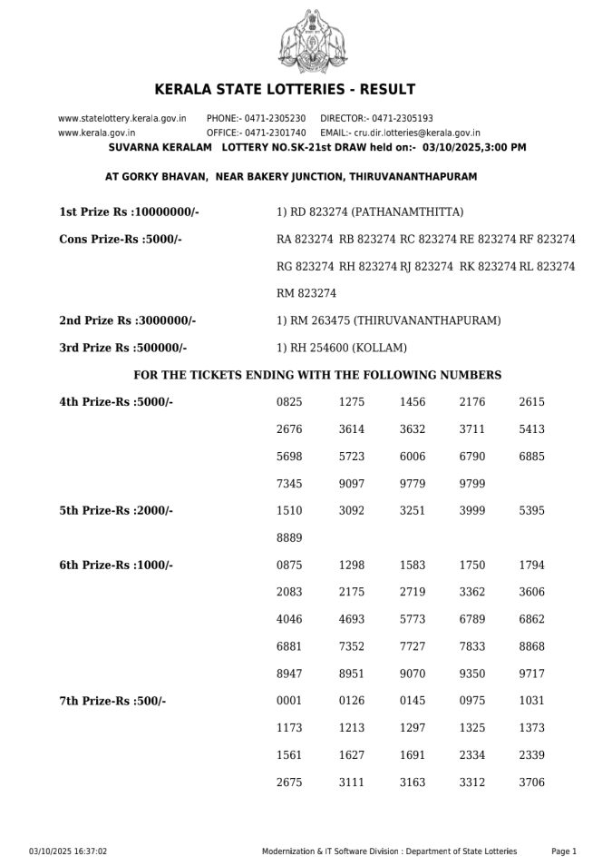 Kerala Lottery Result SK 21 3PM Today 03.10.2025