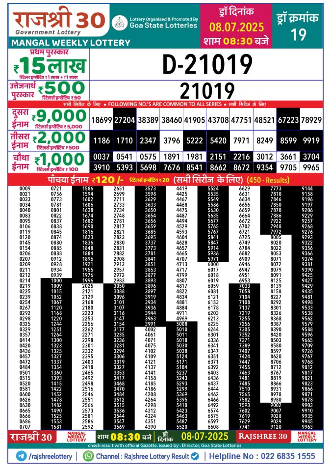 Rajshree Mangal Weekly Lottery 1pm Result 30.09.2025
