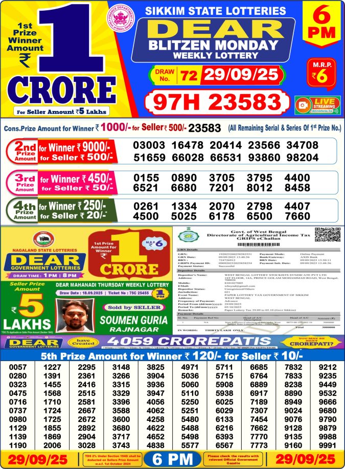 Golden Star Weekly Lottery Result 9pm 29.09.2025