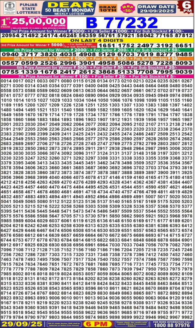 Punjab State Dear 50 6pm Lottery Result 29.09.2025