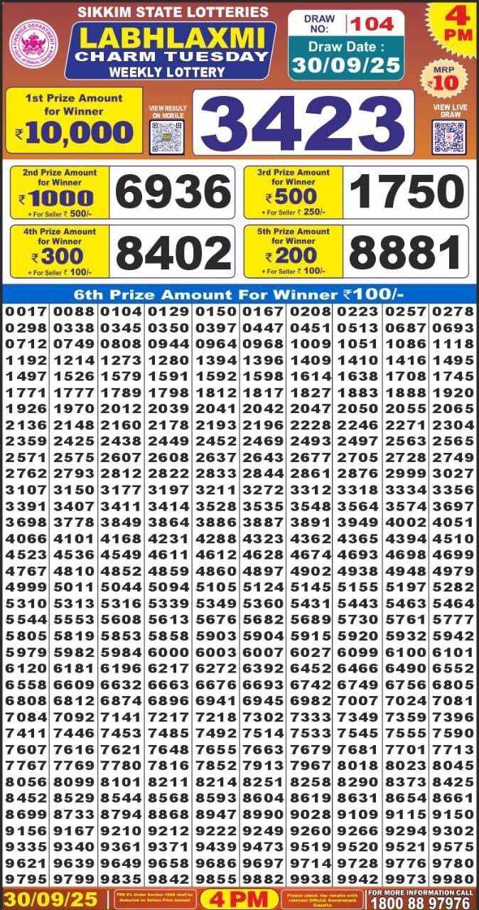 Golden Star Weekly Lottery Result 9pm 30.09.2025