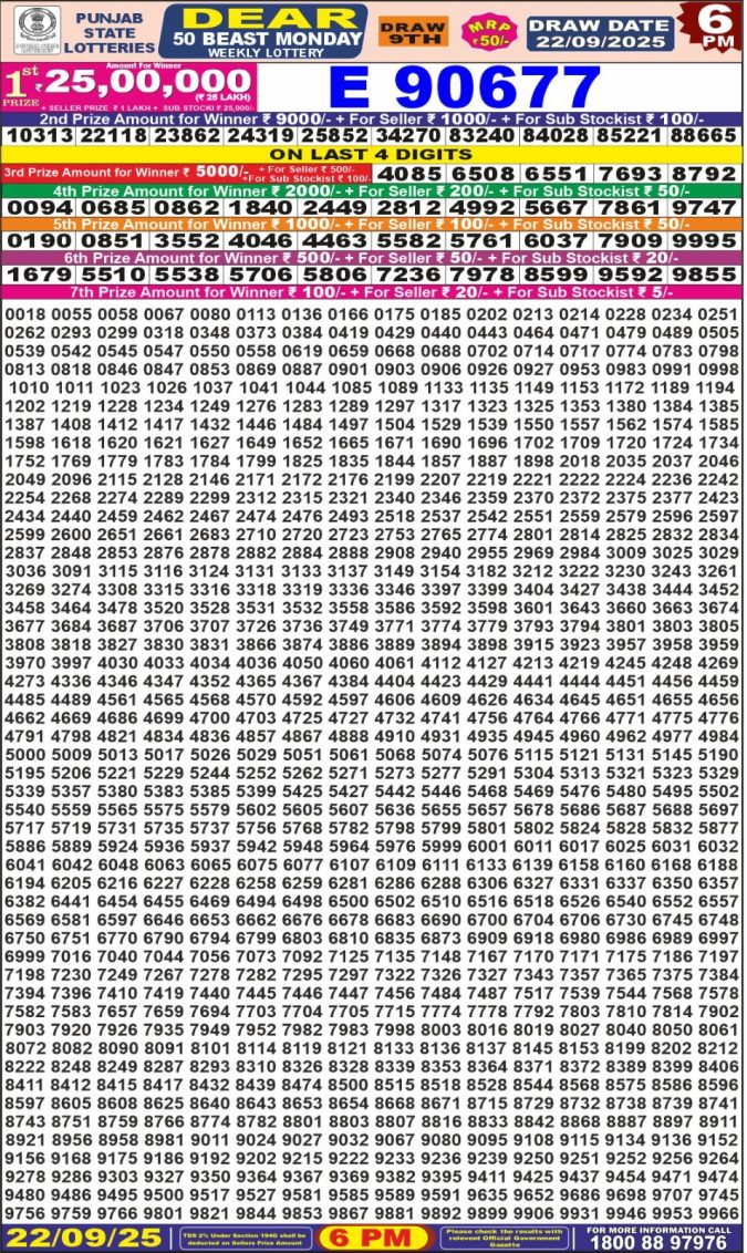Punjab State Dear 50 6pm Lottery Result 22.09.2025