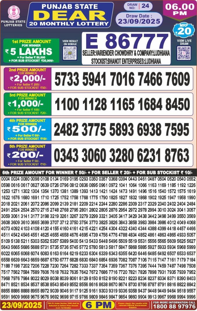 PUNJAB STATE DEAR 20 MONTHLY LOTTERY RESULT 23.09.2025