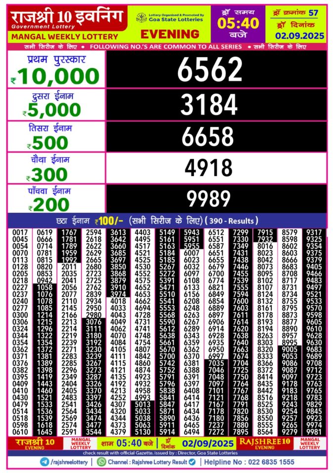 Rajshree 10 Evening Tuesday 5:40pm Result 02.09.2025